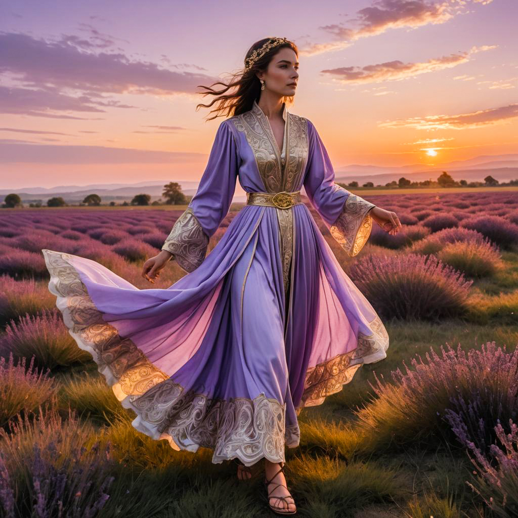 Slender woman wearing a flowing lavender medieval-style robe with gold trim and ornate details, walking through a lavender field at sunset. The robe features long sleeves and a high collar, complemented by sandals. The vibrant sunset glow and open field create a mystical and graceful atmosphere.