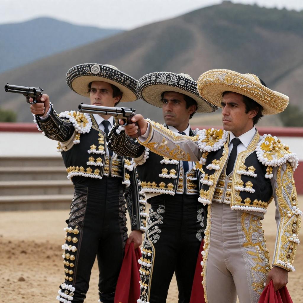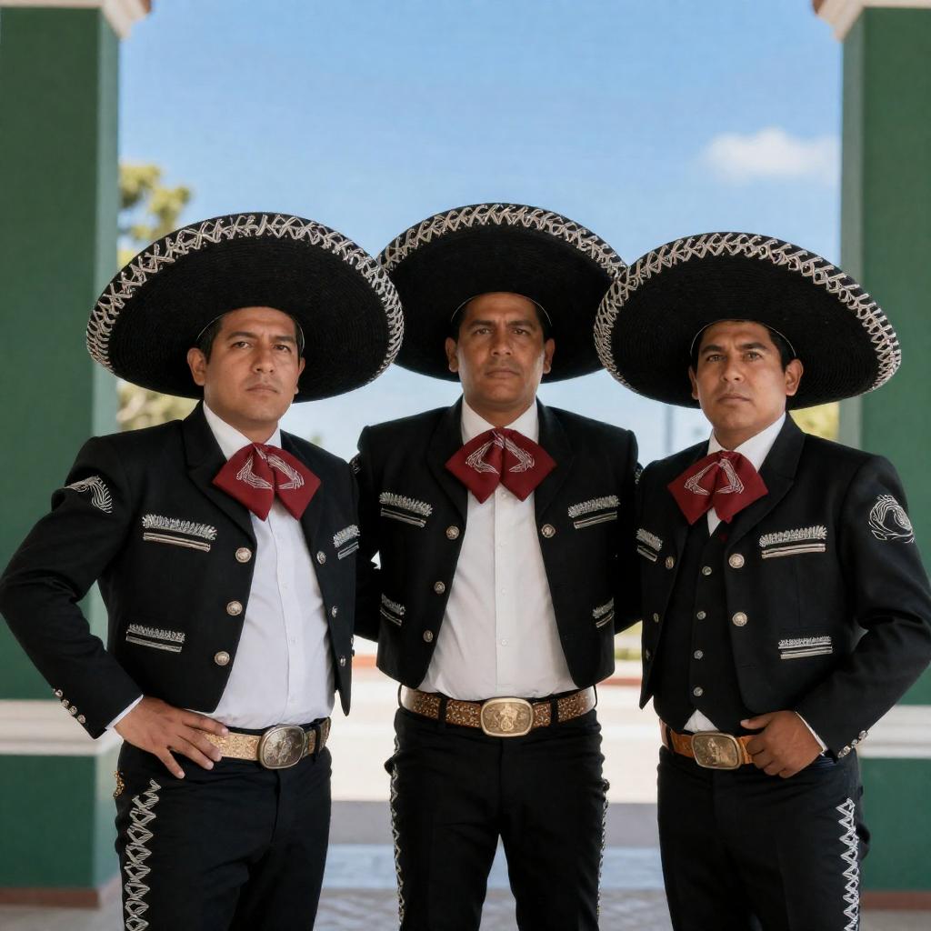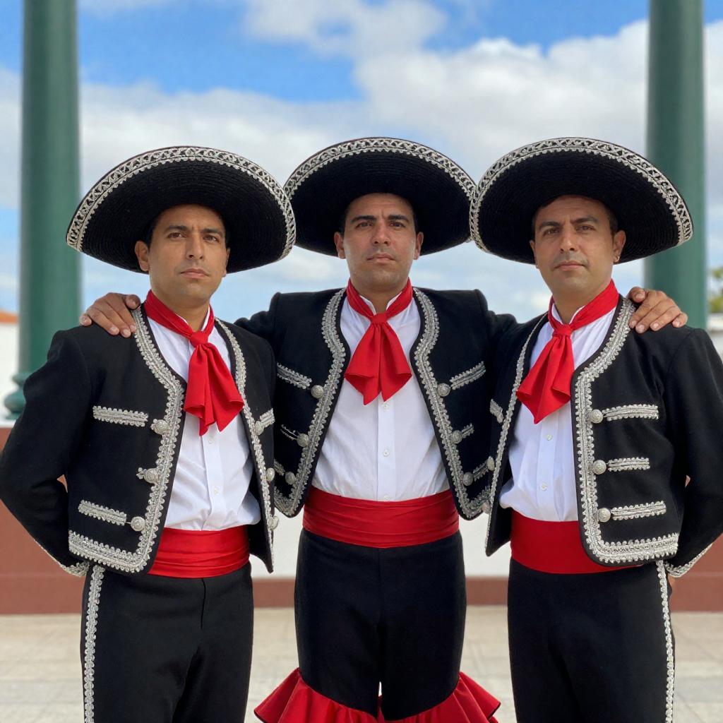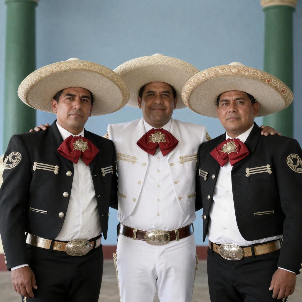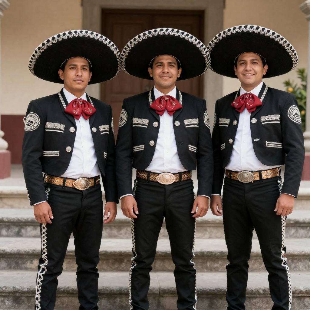 Three male performers in traditional Mexican charro suits with large black sombreros, white shirts, red bow ties, and black and white embroidered jackets. They stand on a stone staircase, one on the left, one in the middle holding hands, and one on the right. Background includes a beige wall and greenery. Middle performer smiles, others have neutral expressions. Middle performer's jacket is open, others are closed. All wear black belts with ornate designs.