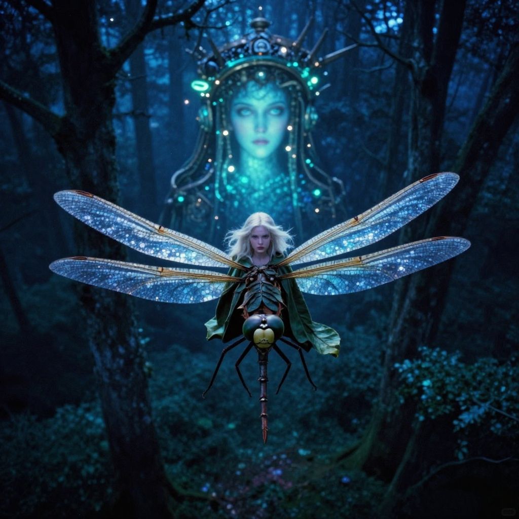 Photograph-like digital artwork featuring a blonde woman with pale skin, floating in a dense, dark blue forest. She has large, iridescent blue dragonfly wings and a dragonfly-like body with a yellow head and black legs. Her expression is serene. Behind her, an ethereal, glowing blue face with intricate, ornate framing is centered, surrounded by luminescent patterns. The forest background is rich with dark, towering trees and subtle blue lights. The image has a mystical, fantasy-like atmosphere, blending realism with surreal elements.