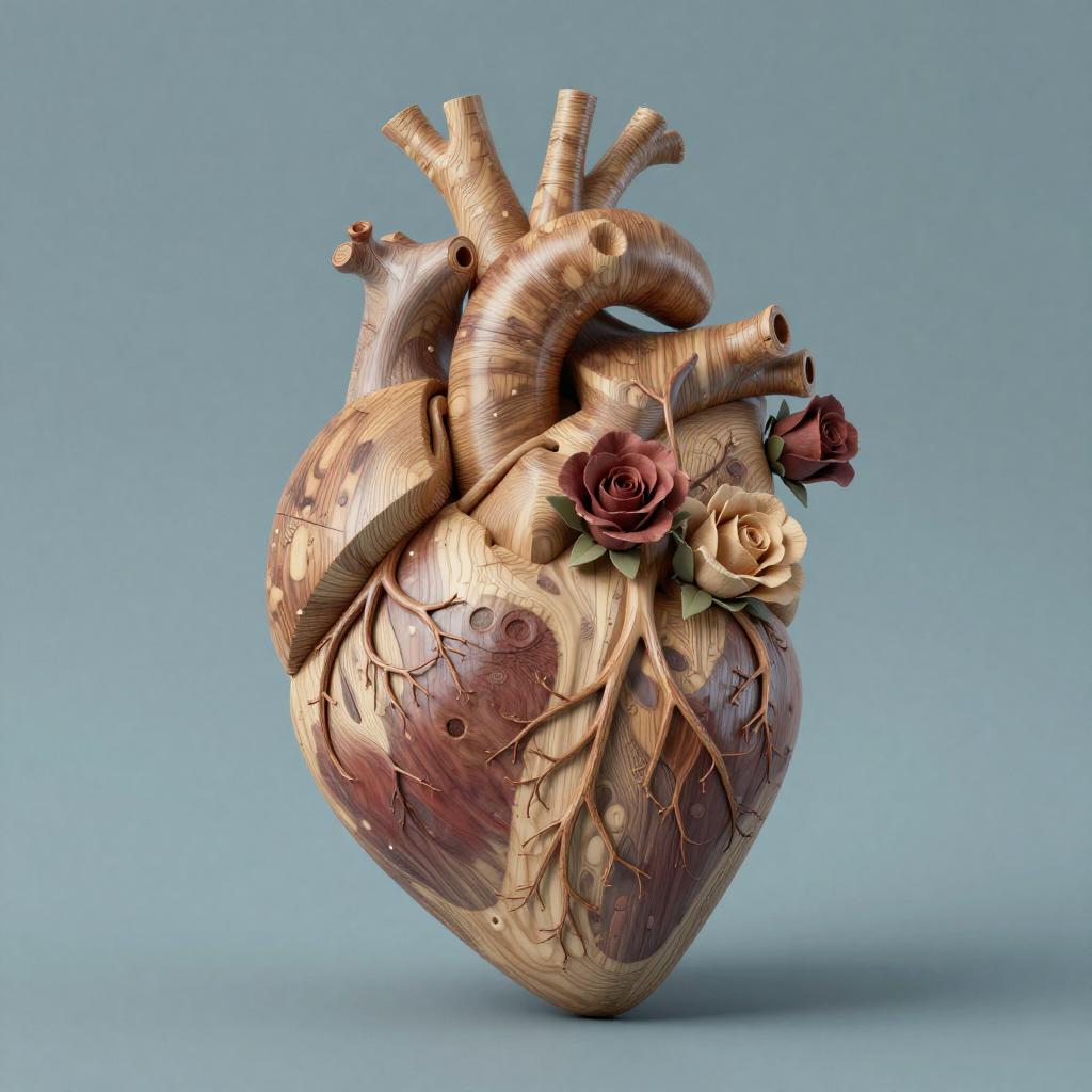 Heartart, realistic heart anatomy model, made out of wood and roses, dblx, photohelper, render, cgi, 3d, extremely detailed, wooden veins, colored backdrop