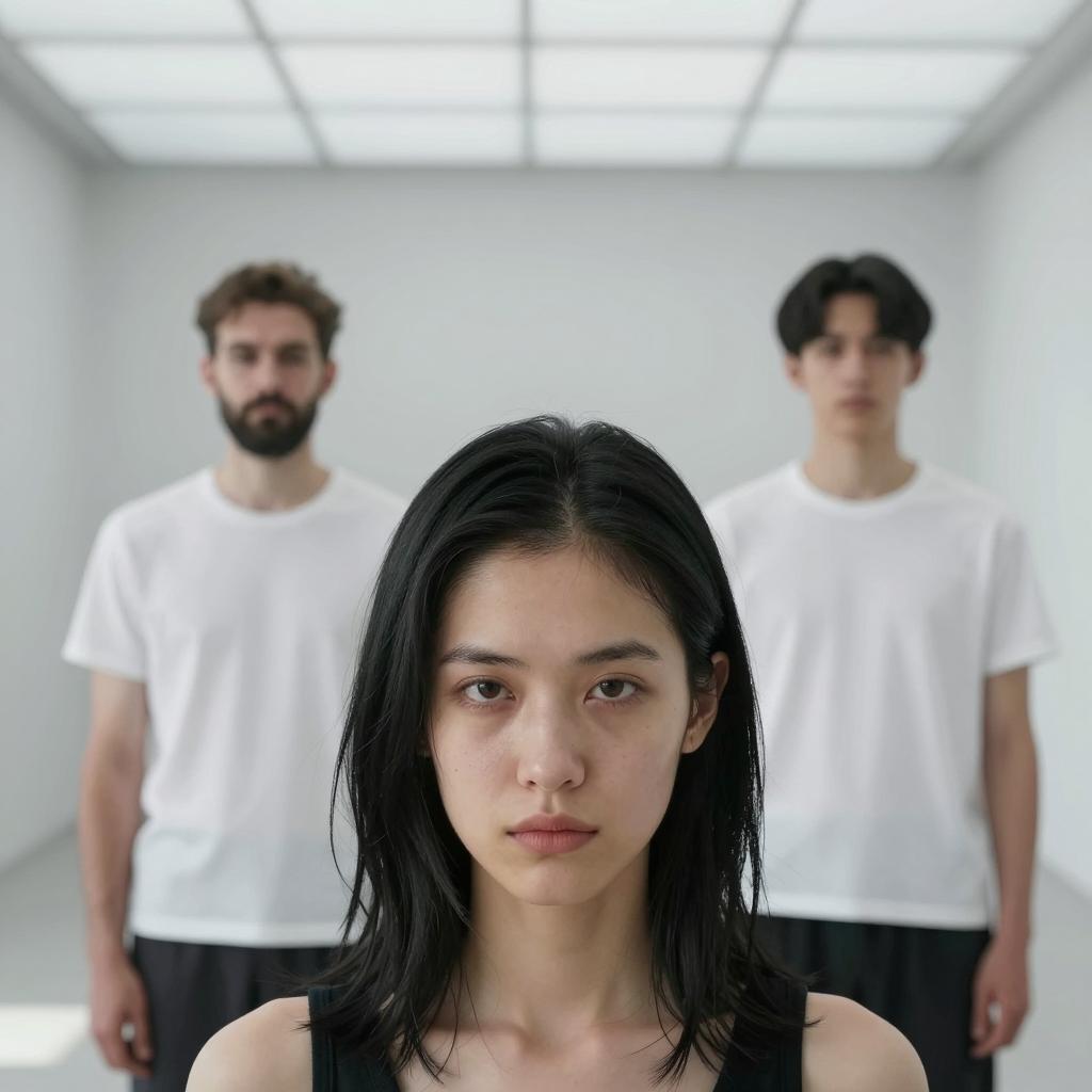A woman with shoulder-length black hair, pale skin, and a serious expression in the foreground. Two men in white t-shirts and shorts stand in the background, one with a beard and the other with short hair. The room has a grid-like pattern of shadows on the ceiling and walls. The men are blurred, with the woman in sharp focus.