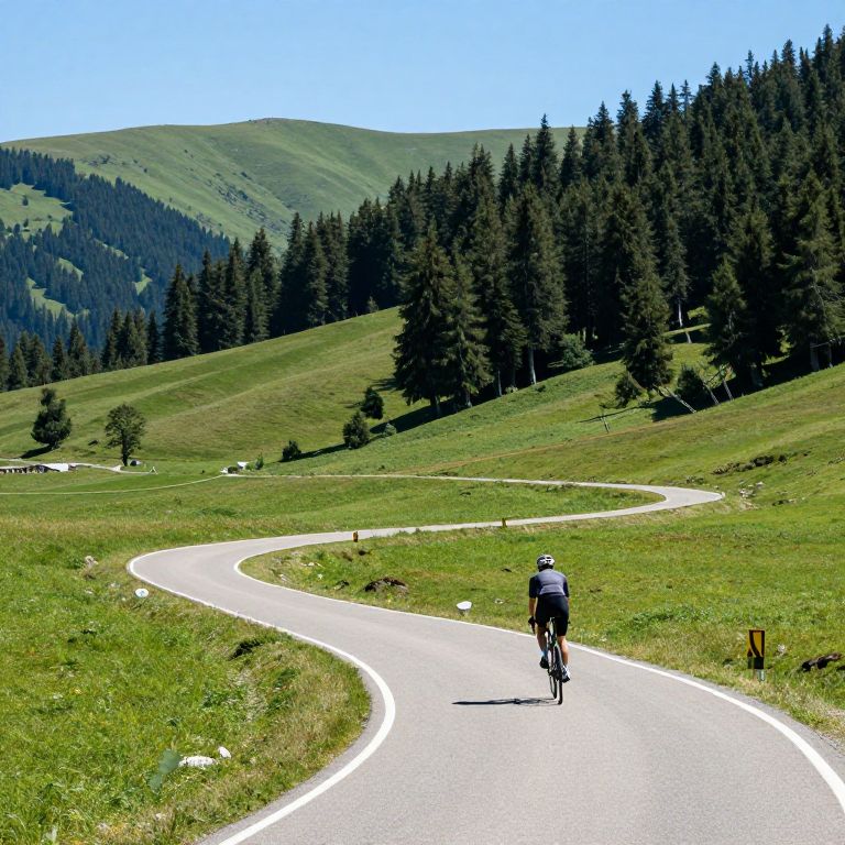Photograph of a bicycle race in a grassy field with a mountainous background. Ten cyclists, wearing colorful spandex racing suits and helmets, ride in a line on a paved path. The cyclists are in various positions, indicating a competitive race. The mountains behind are rugged with steep slopes, under a clear blue sky. In the mid-ground, there are white buildings and scattered trees. The grass is lush and green, contrasting with the dark, rocky mountains. The image captures the dynamic movement of the cyclists against the serene natural landscape.