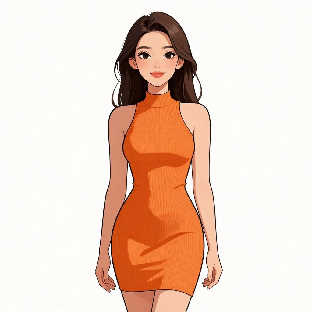 Woman with pretty face and pretty hair. smiling Woman, contemporary, ribbed bodycon mini dress in vibrant orange, high neck with halter strap, sleeveless, exposed shoulders, plain texture, above-knee length, white background. --sref 1467