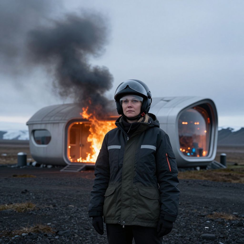 A woman in a reflective helmet and utility jacket stands in front of a futuristic home on fire with black smoke, set against a muted, cold Icelandic landscape at dusk.