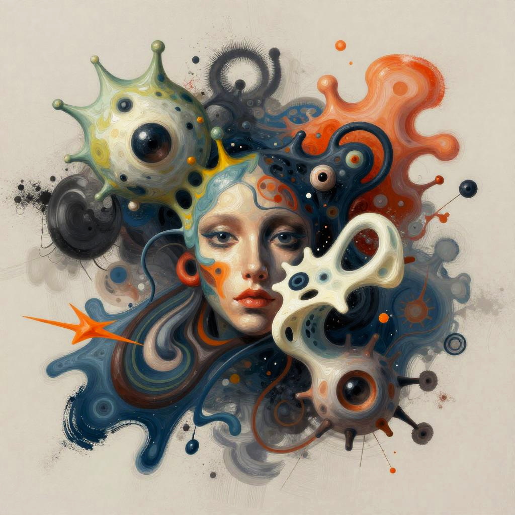 Groв§e portrayed in an abstract form with surreal shapes and vibrant colors, dynamic brush strokes and fluid textures, merging organic and mechanical elements, evoking a sense of growth and transformation, contemporary digital art style