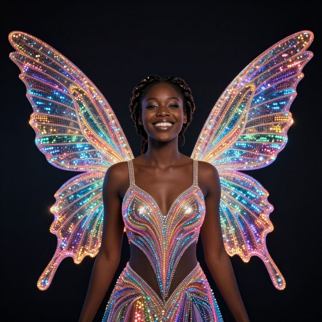 Photograph of a smiling Black woman with glowing, multicolored, sequined fairy wings and a matching dress against a black background.