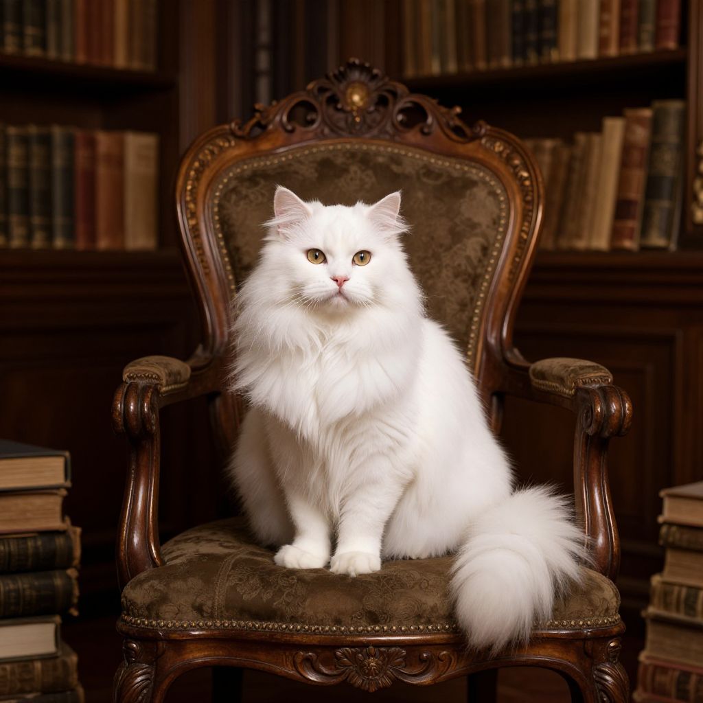 Big white fluffy cat sitting regally on an ornate antique wooden chair in a lush library filled with old books and warm lighting, intricate textures, Baroque style surroundings, mysterious and elegant atmosphere, high detail photorealistic image