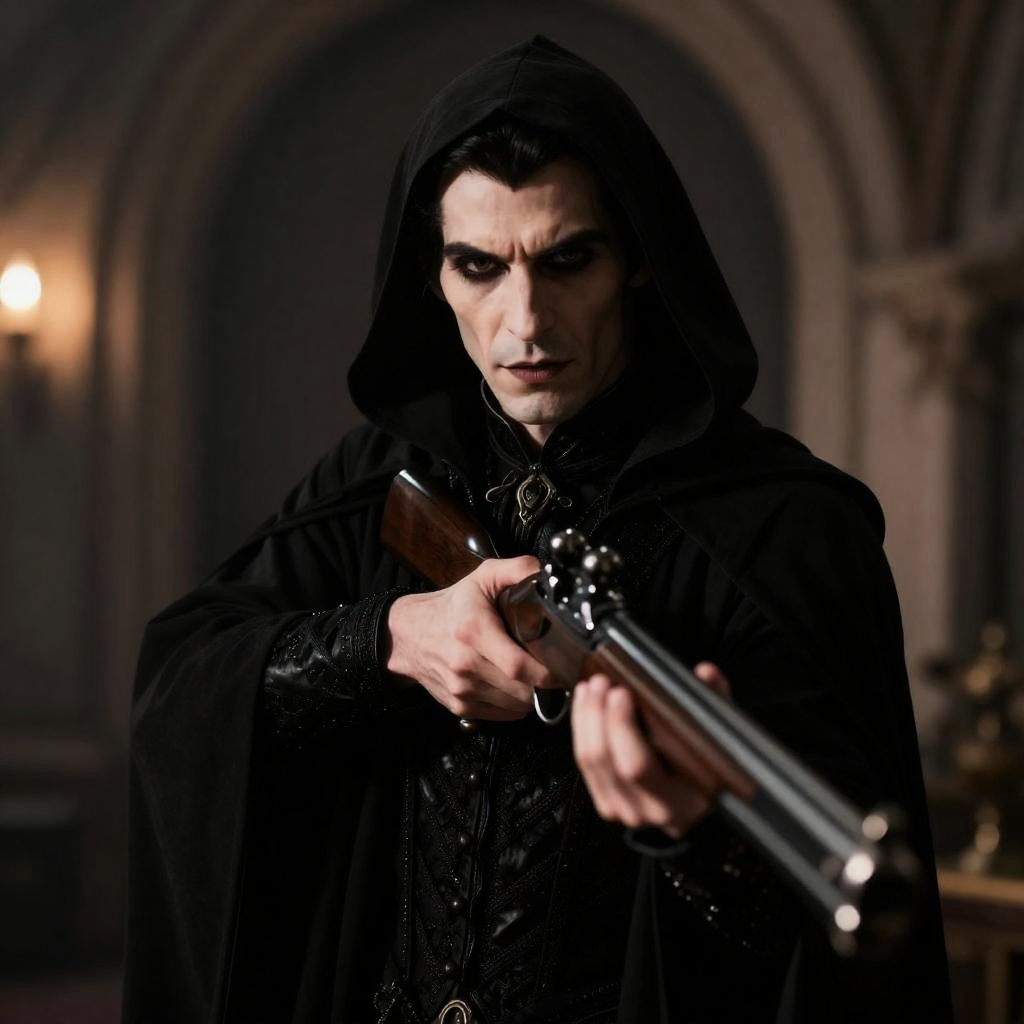 A detailed and realistic portrait of a Victorian vampire wearing a black hooded cloak and dark makeup around the eyes. The vampire is holding a double-barrel shotgun, aiming forward with intense focus. The setting features dim lighting with gothic architectural elements in the background.