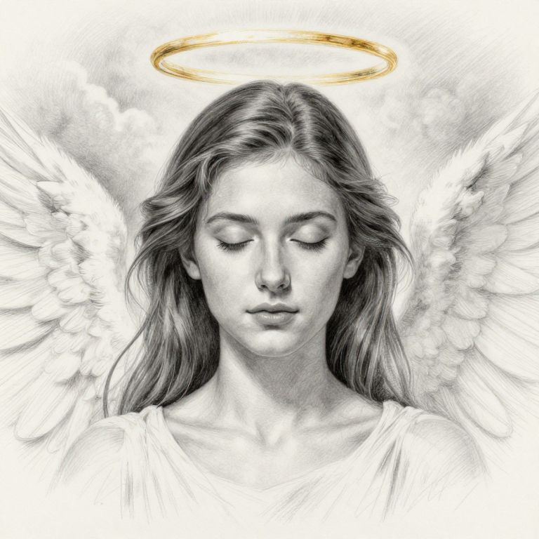 Realistic angel halo drawing, portrait of a peaceful angel with a radiant halo, meticulous pencil shading capturing skin tones and light refractions, halo designed with subtle gold and white hues, ethereal clouds in the background adding depth