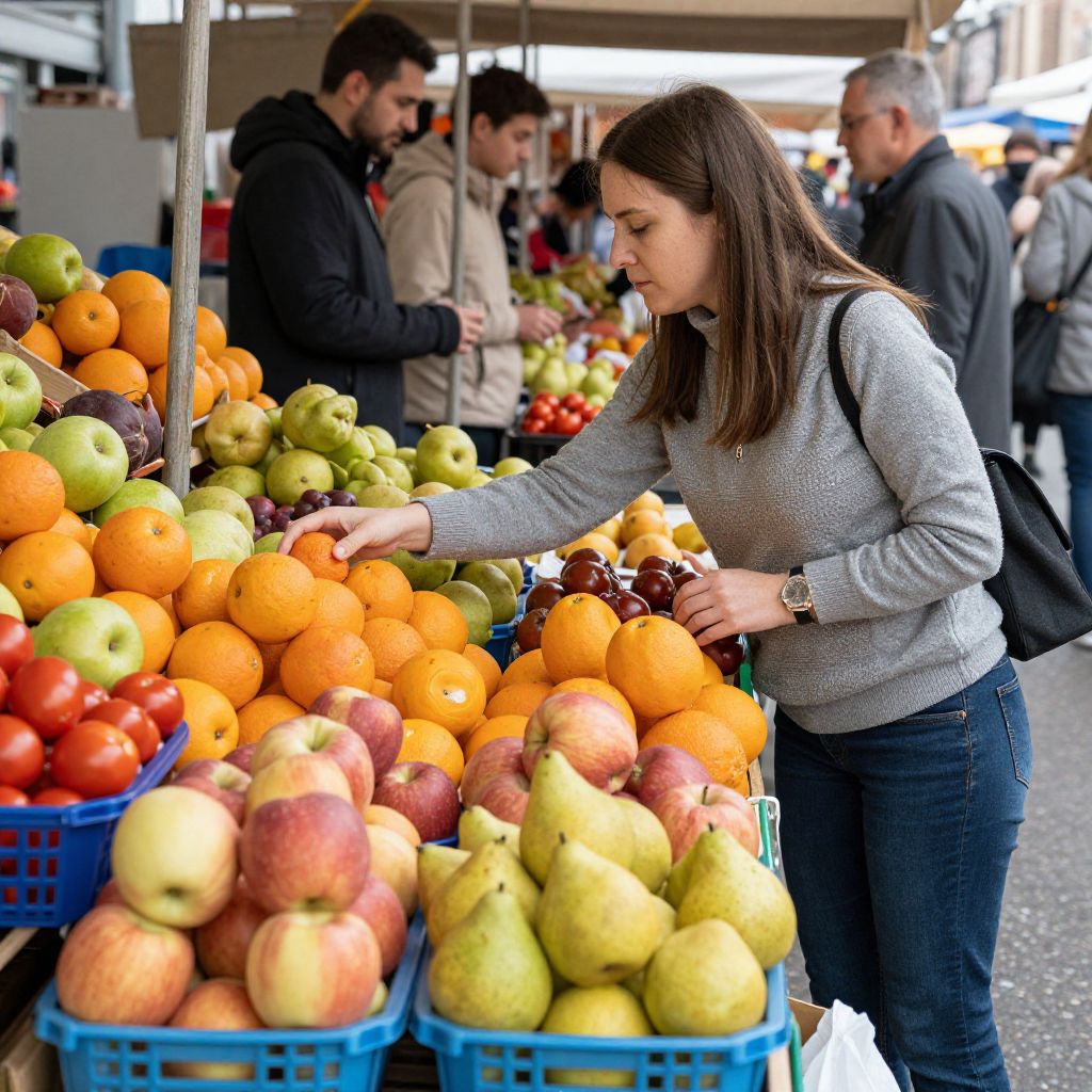 Woman selecting fresh fruits at a vibrant market stall, surrounded by colorful baskets filled with apples, oranges, pears, and tomatoes, while other shoppers browse nearby.