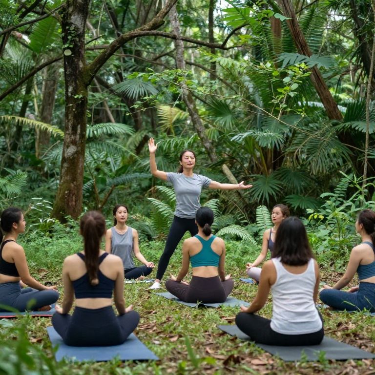 A yoga instructor guiding a class in a lush forest clearing, with trees and foliage surrounding the group, capturing the essence of wellness health in a natural setting.