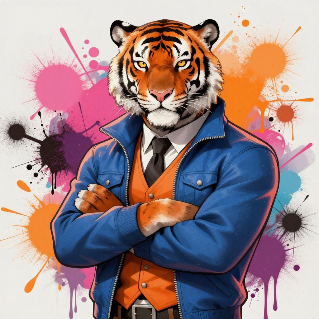 Digital artwork of a tiger anthropomorphized as a combat strategist, depicted in vibrant graffiti art style. The tiger is wearing a blue jacket over an orange vest and tie, with crossed arms and a confident expression. The background features dynamic splashes of pink, orange, white, and black spray paint, adding urban and edgy vibes. High-resolution illustration inspired by street art and character design trends on platforms like ArtStation and DeviantArt.
