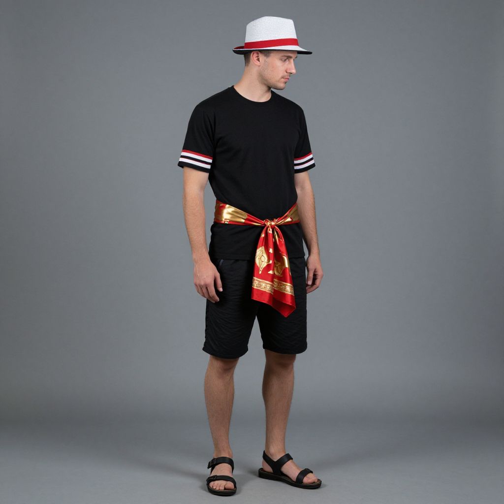 Man wearing a black shirt with red and white stripes on the sleeves and black shorts. He is also wearing a white hat with a red stripe on the side. He has a red and gold scarf tied around his waist and is wearing a pair of black sandals.