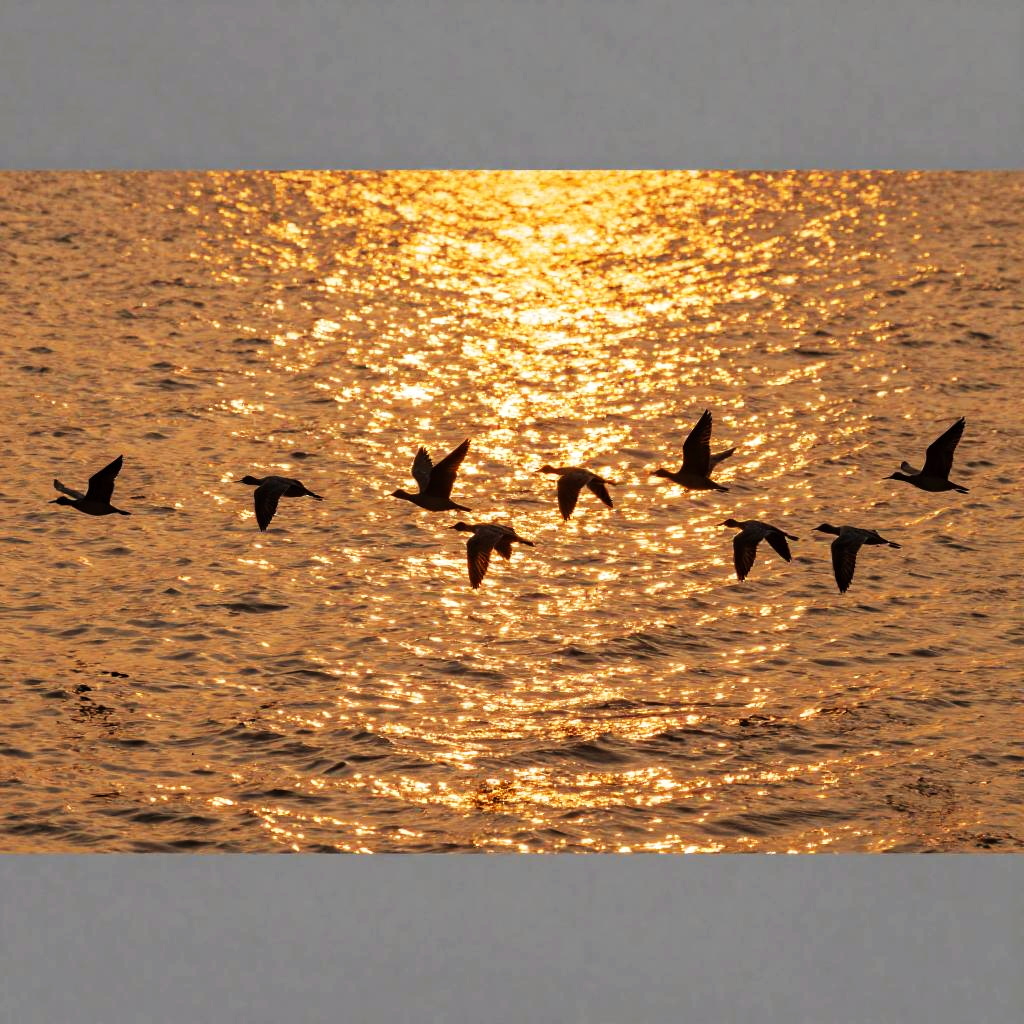 Photograph of a serene sunset over a calm sea. A wooden pier stretches horizontally across the lower third of the image, supported by evenly spaced vertical posts. Silhouetted against the vibrant orange and yellow sky, numerous birds perch along the pier's length. The sun, a glowing orb, sits near the center, casting a bright, golden reflection on the water's surface. The sky transitions from a deep orange at the horizon to lighter shades above. The overall scene exudes tranquility and natural beauty, with the warm colors of the sunset contrasting against the dark silhouette of the pier and birds.