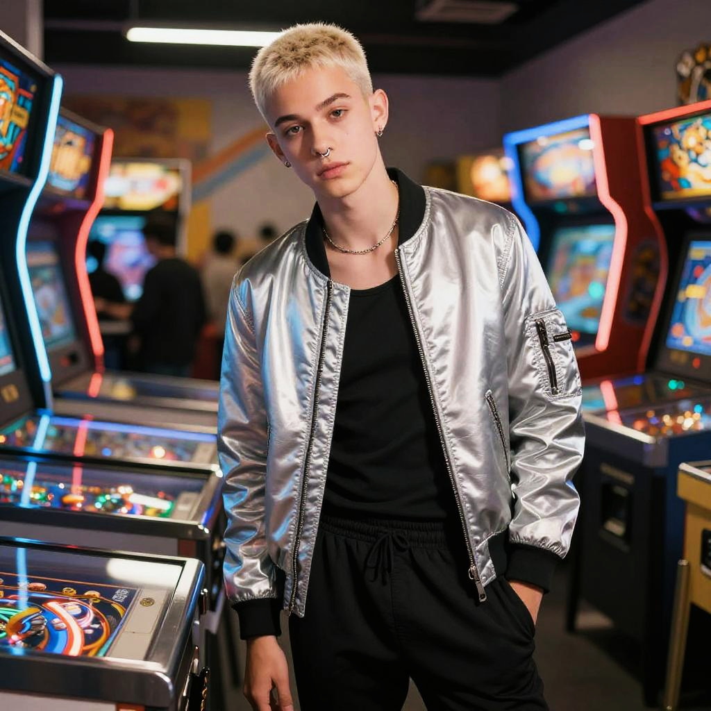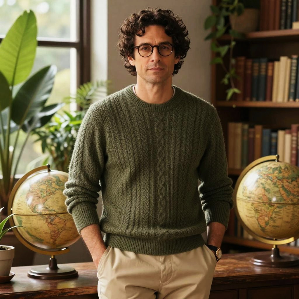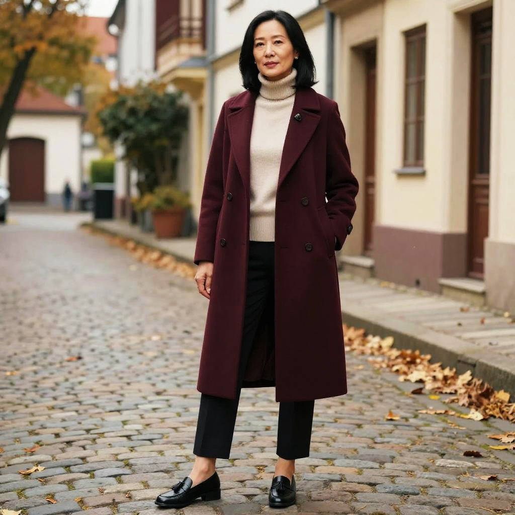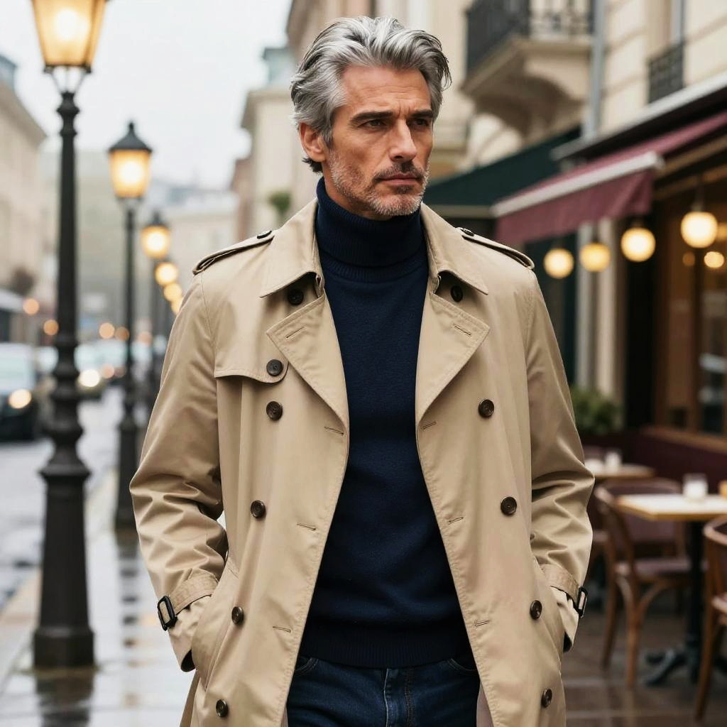 Cinematic portrait of stylish middle-aged man with salt and pepper hair styled in a pompadour wearing a burgundy velvet blazer worn atop a black turtle neck and tailored pants, posed in a smoky jazz lounge with vintage instruments and dim amber lighting. Soft natural light, editorial fashion mood, shallow depth of field, realistic skin texture, high detail, elegant confident pose, glossy highlights, subtle film grain, balanced composition, magazine-quality color grading.