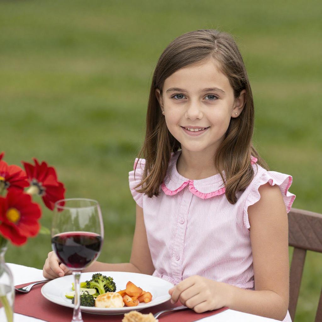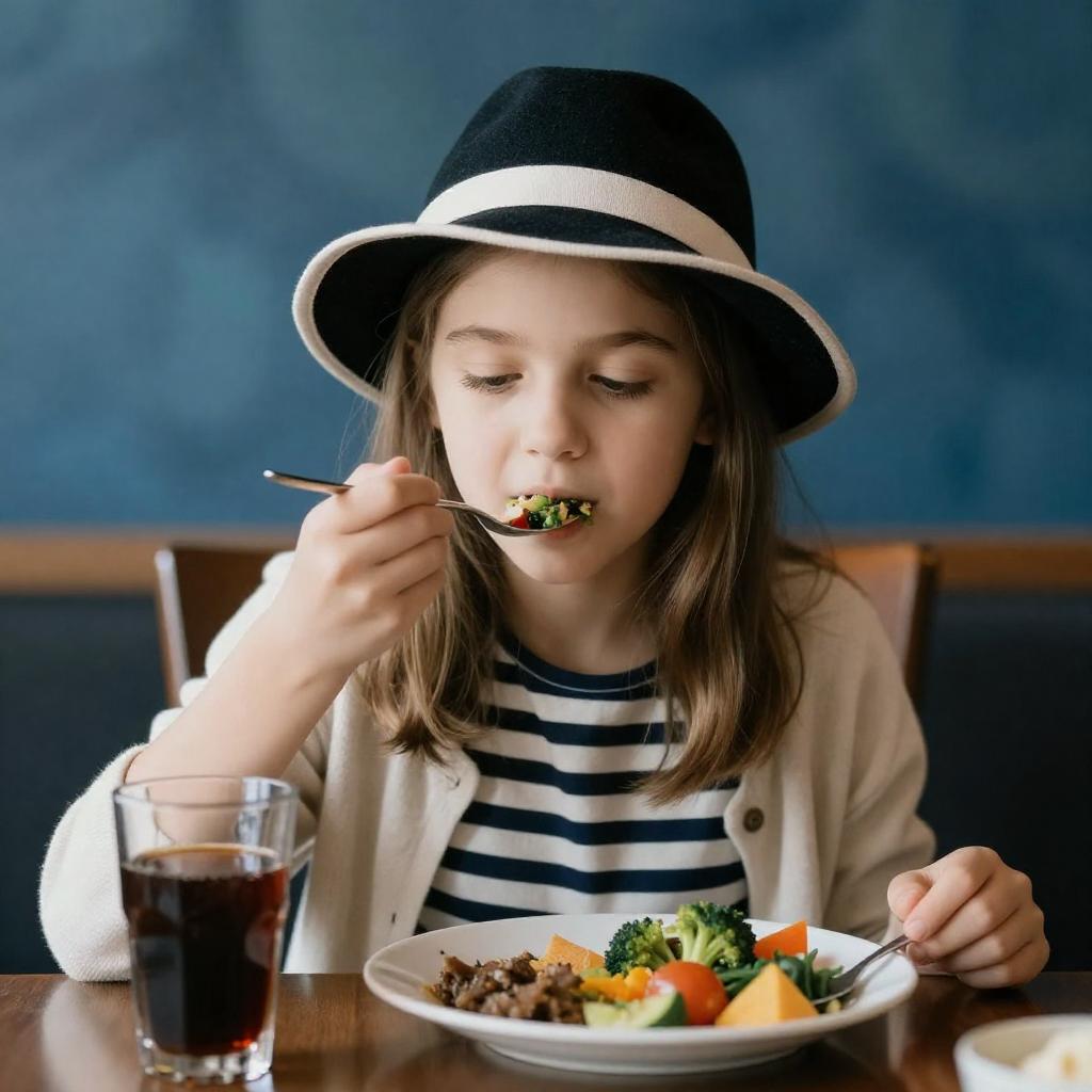 Photograph of a young girl with light skin and straight brown hair, wearing a beige cardigan over a black-and-white striped shirt, and a black hat with white trim. She sits at a dark wooden chair, eating a meal with a glass of dark liquid on the left and a plate of colorful vegetables on the right. The background features a blue, abstract-patterned wall.