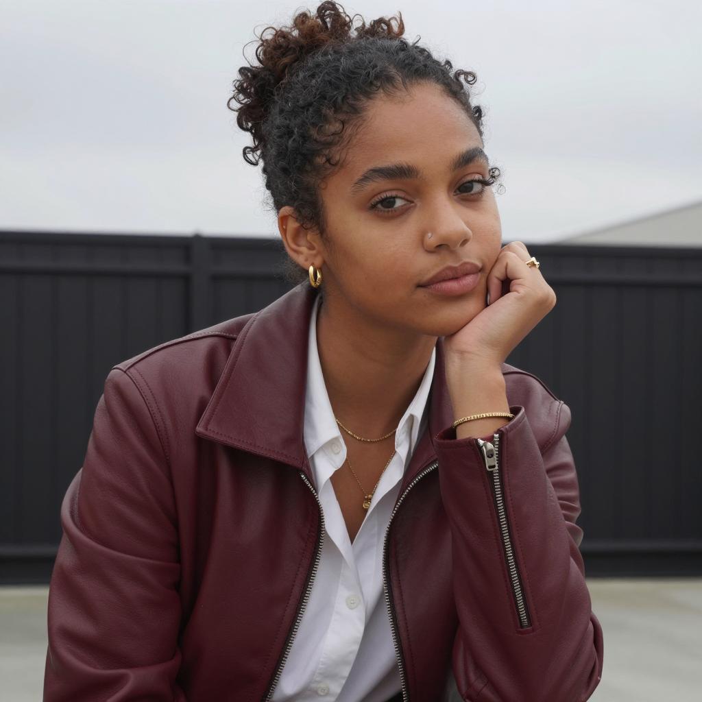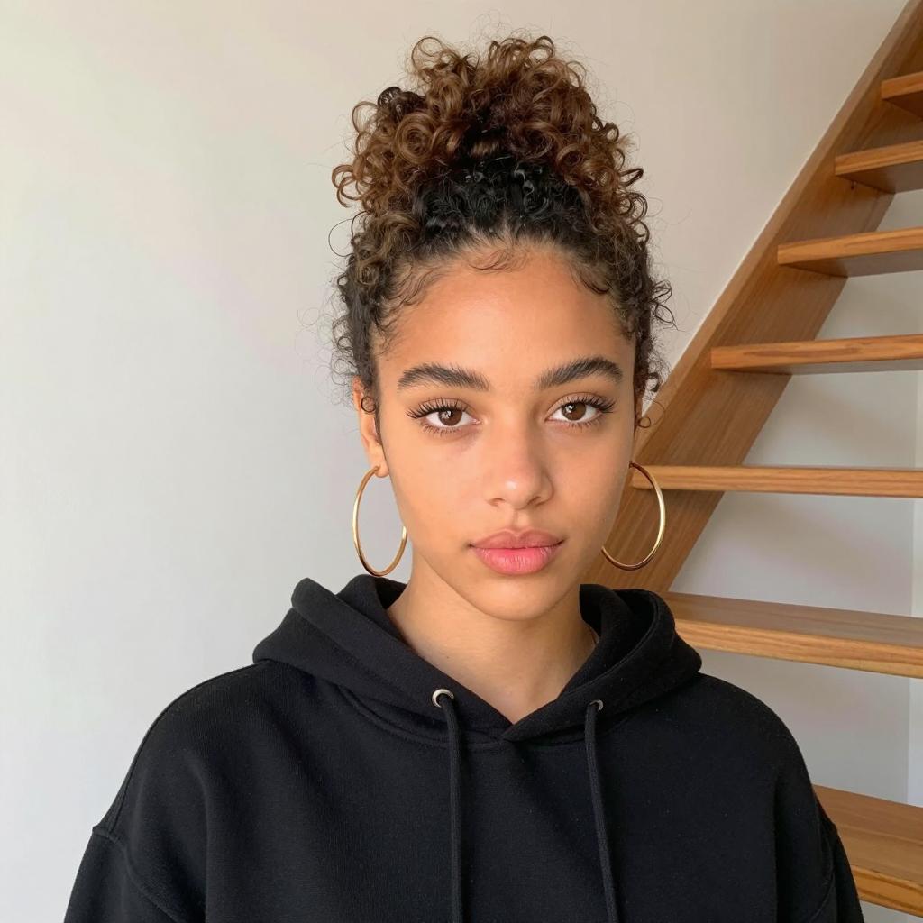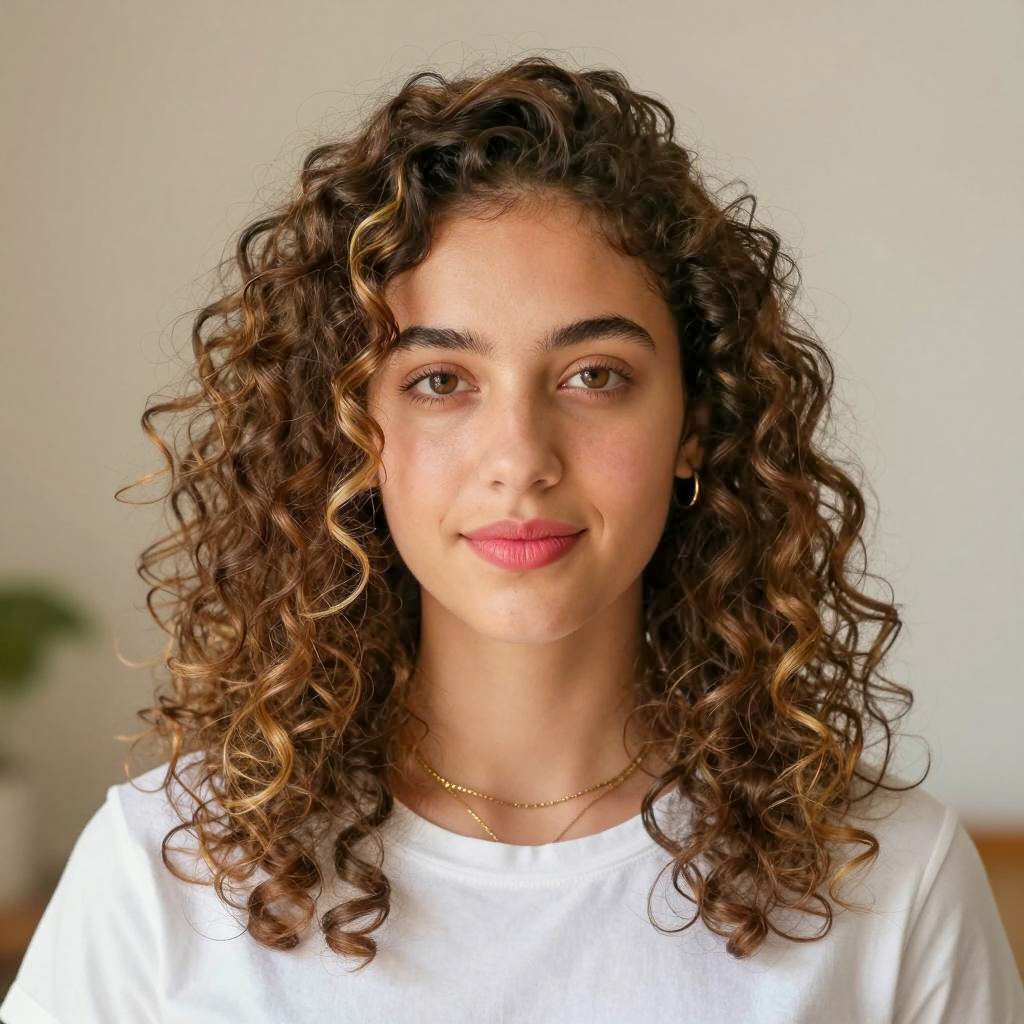 This captivating portrait features a young woman with curly hair, embodying natural beauty against a serene lakeside backdrop. The soft lighting and reflections in the water create a tranquil atmosphere, perfect for showcasing elegance and grace.