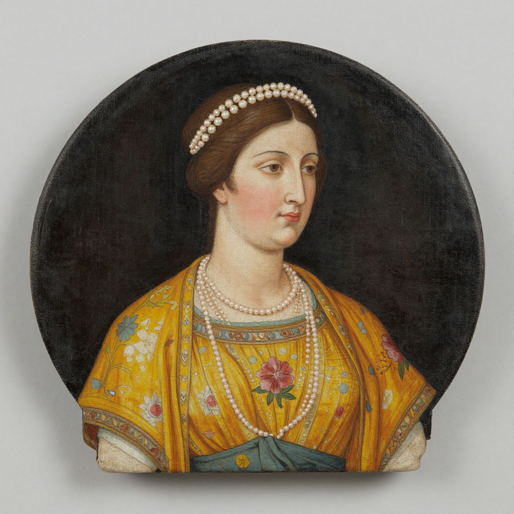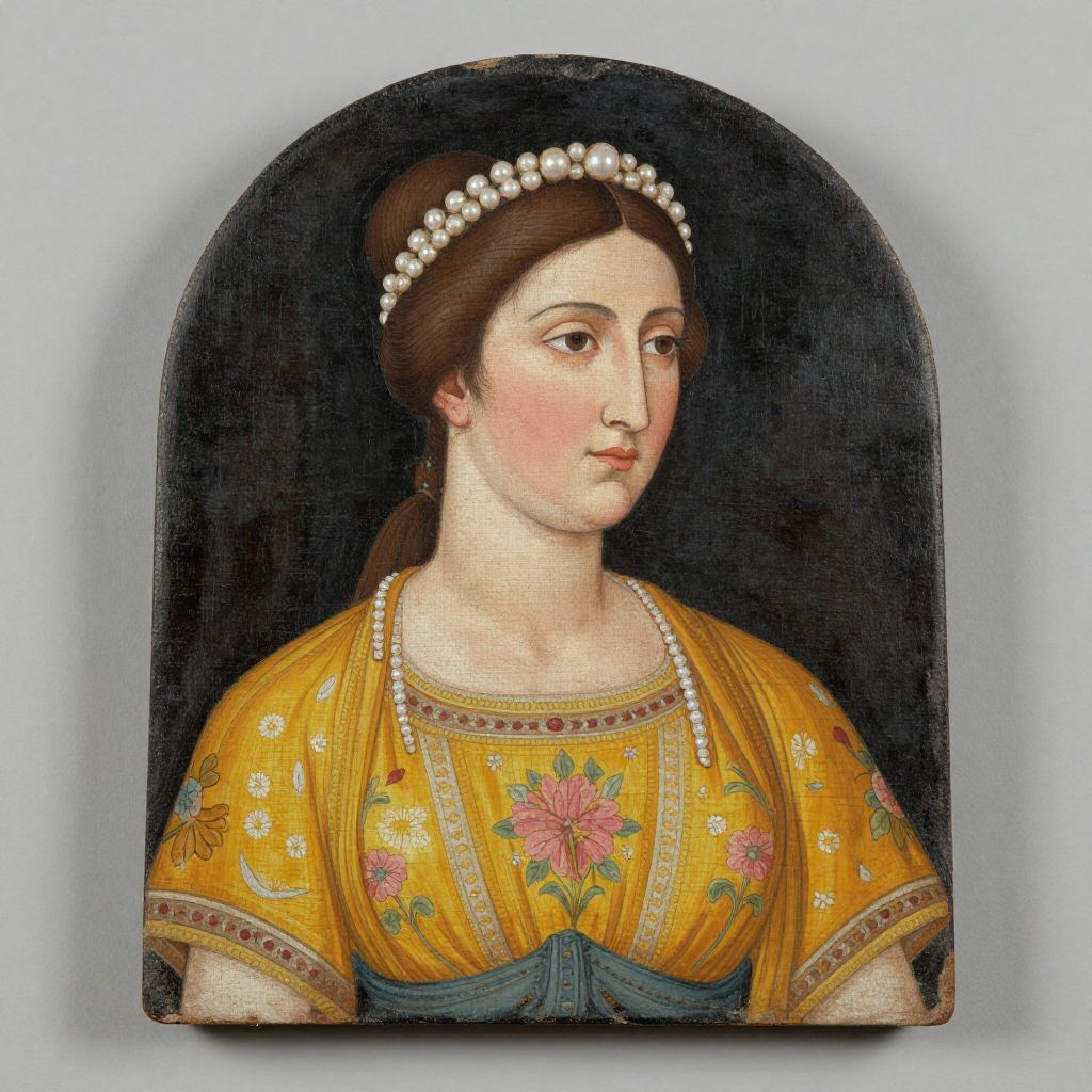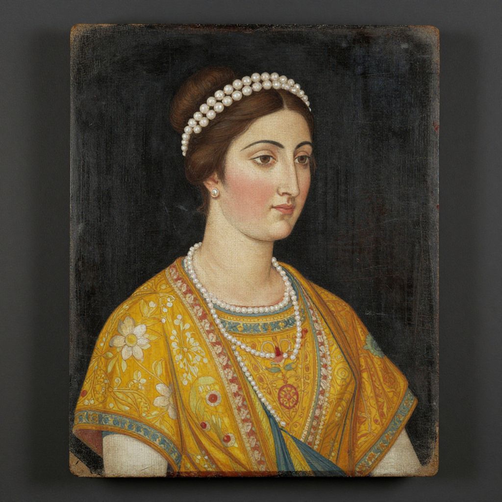 Elegant funerary portrait of a woman, painted in encaustic on linen during the Antonine period (circa 138-192 AD), showcasing her adorned with a pearl-studded headband and a vibrant yellow garment with floral patterns, set against a dark background, housed at the Cleveland Museum of Art.