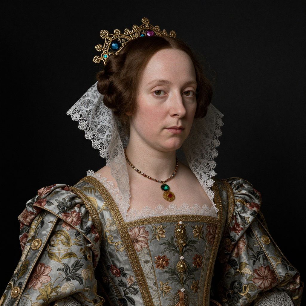 A finely detailed Renaissance-style portrait reminiscent of Hans Holbein the Younger's technique, featuring a woman adorned in ornate period attire with intricate floral patterns and lace embellishments, captured in a high-definition digital rendering with dramatic chiaroscuro lighting.