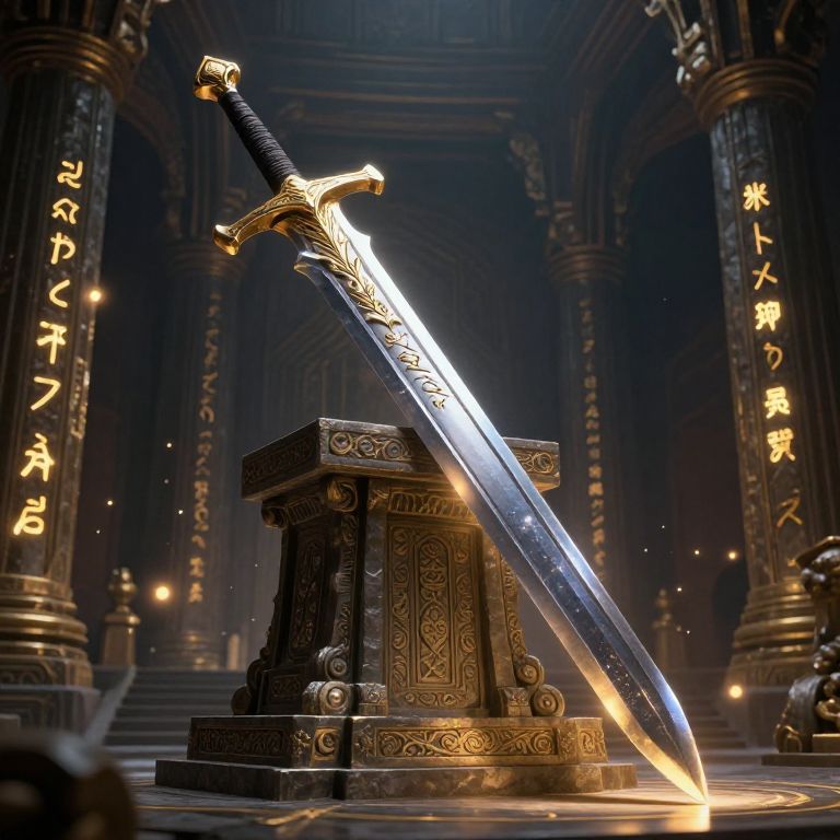 Epic fantasy longsword art depicting a massive sword forged from rare celestial metals, resting on an ornate stone pedestal in a grand ancient temple, with glowing golden inscriptions and floating particles of light in the air.