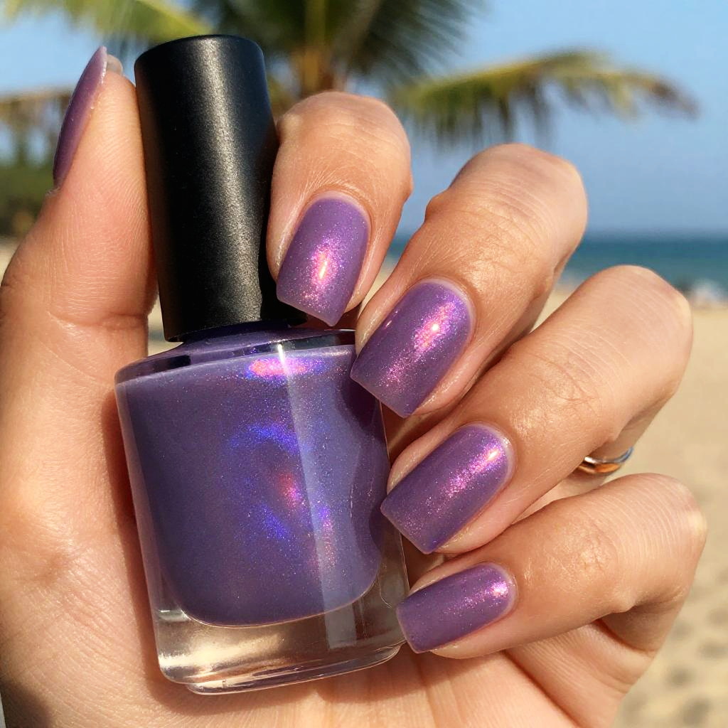Elegant hands with summer purple nail polish, smooth glossy texture, surrounded by blooming lavender fields under clear blue sky, fresh and lively summer vibe