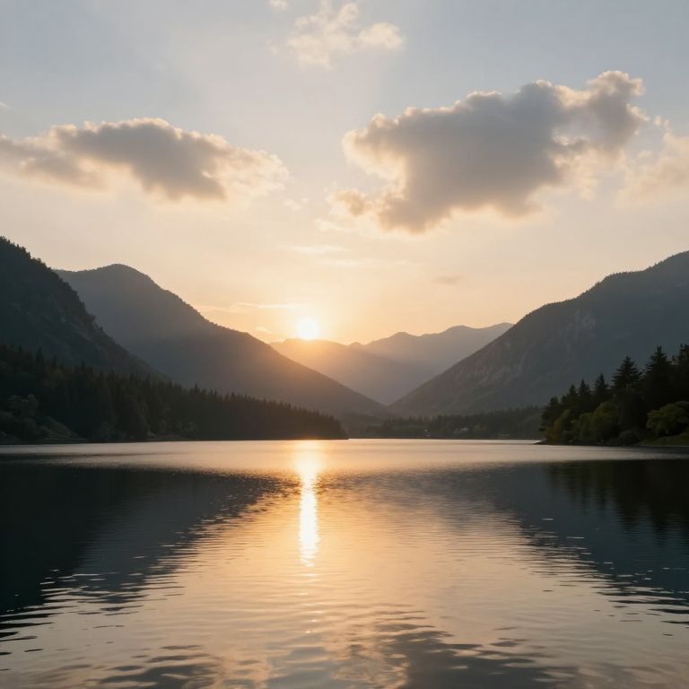 Photograph of a serene lake at sunset, with golden sunlight reflecting on calm waters, surrounded by dark, silhouetted mountains and dense forest under
