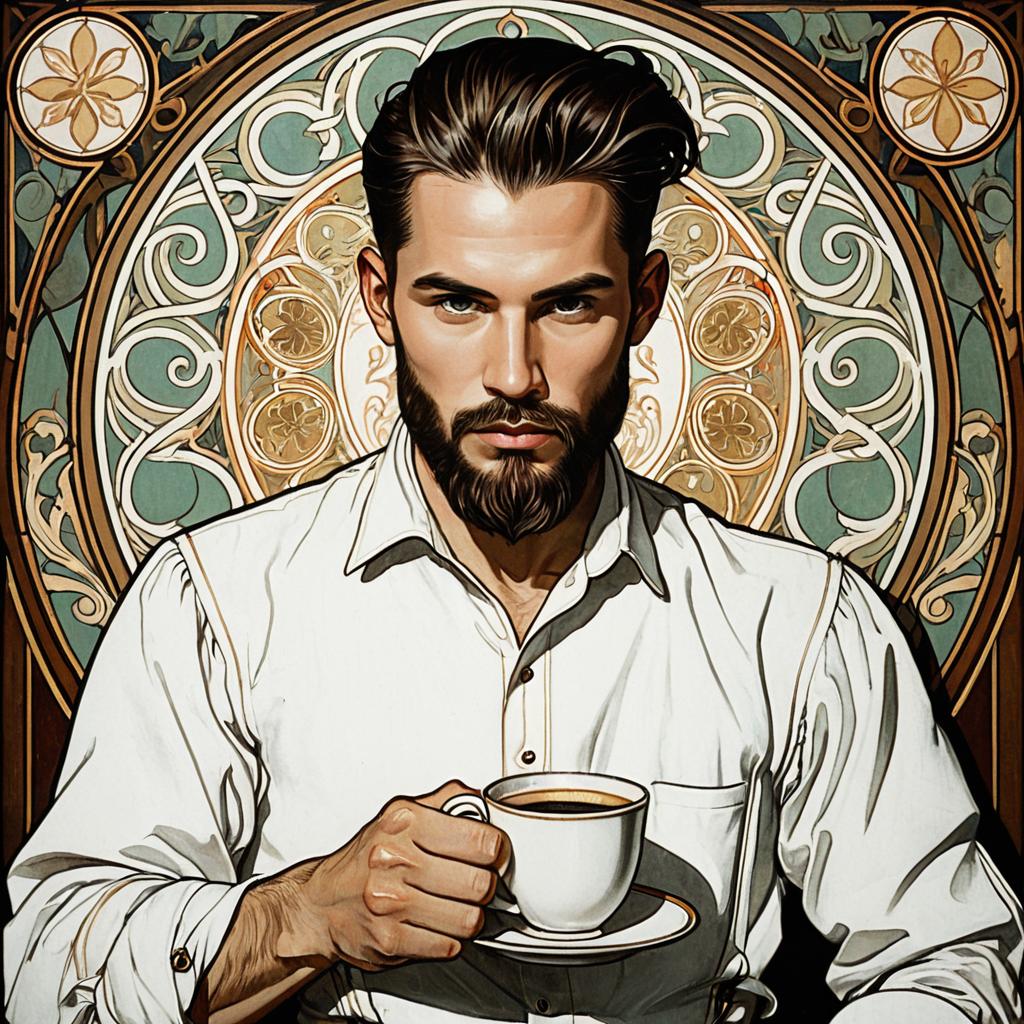 A portrait of a young man with slicked-back hair and a trimmed beard, wearing a crisp white shirt with rolled-up sleeves, holding a steaming cup of coffee, painted in the style of Alphonse Mucha, featuring art nouveau patterns and delicate line work, reflecting vintage elegance