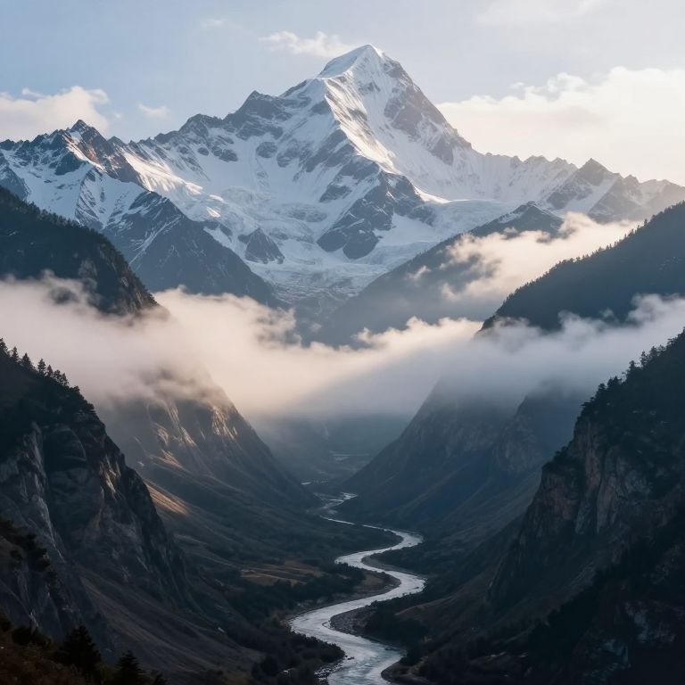 Majestic snow-capped peaks rise dramatically above a serene valley, where misty clouds drift lazily between rugged cliffs and a winding river below, bathed in soft morning light.