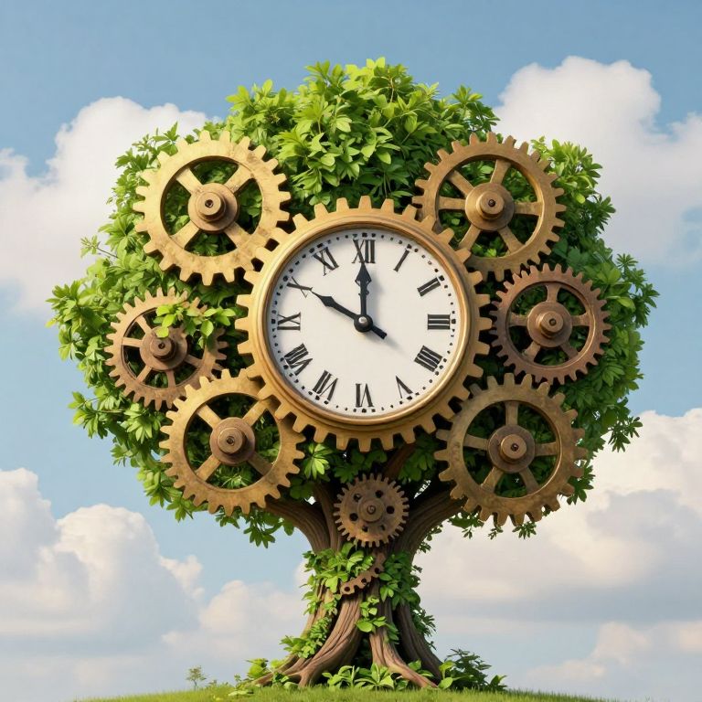 Clockwork gears intertwine with verdant foliage, forming a surreal tree-like structure that seamlessly blends nature and machinery, its central clock face crowned by lush green leaves against a serene sky dotted with fluffy clouds.