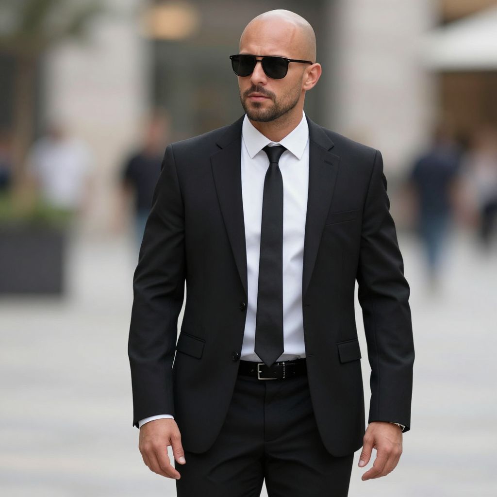 Man black suit costume, 1boy, solo, bald, male focus, necktie, shirt, black necktie, suit, white shirt, formal, jacket, collared shirt, pants, belt, facial hair, black pants, blurry background, standing, blurry, outdoors, long sleeves, black belt, sunglasses, black jacket
