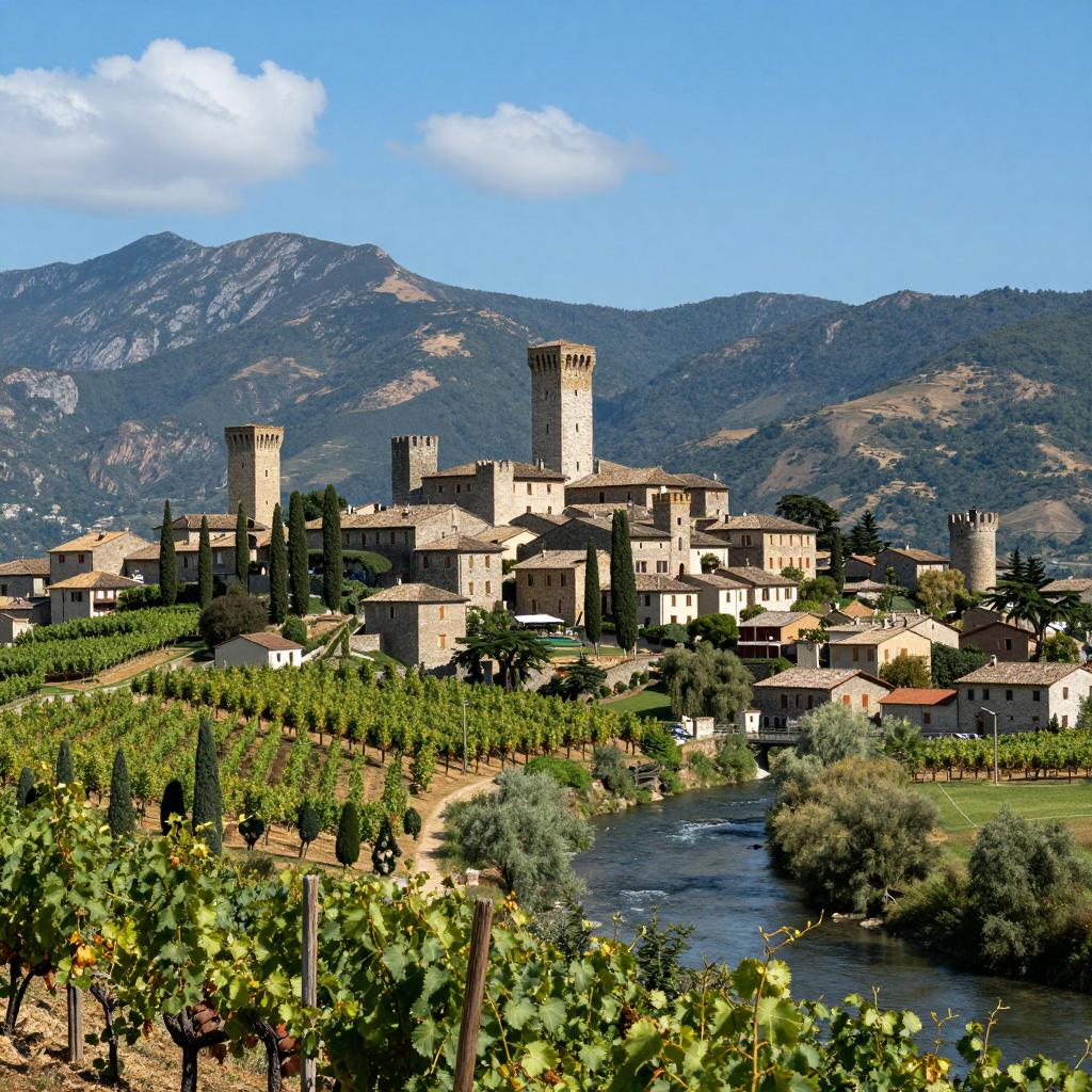 Scenic view of a medieval Italian village nestled in lush vineyards with cypress trees, along a winding river in the Apennine mountain range. The rugged mountains provide a dramatic backdrop under a clear blue sky with scattered clouds. Traditional stone buildings and medieval towers are visible, reflecting rural Italian architecture and the region's historical heritage.