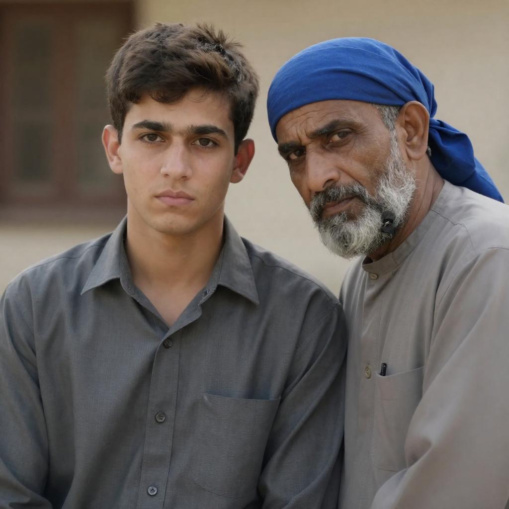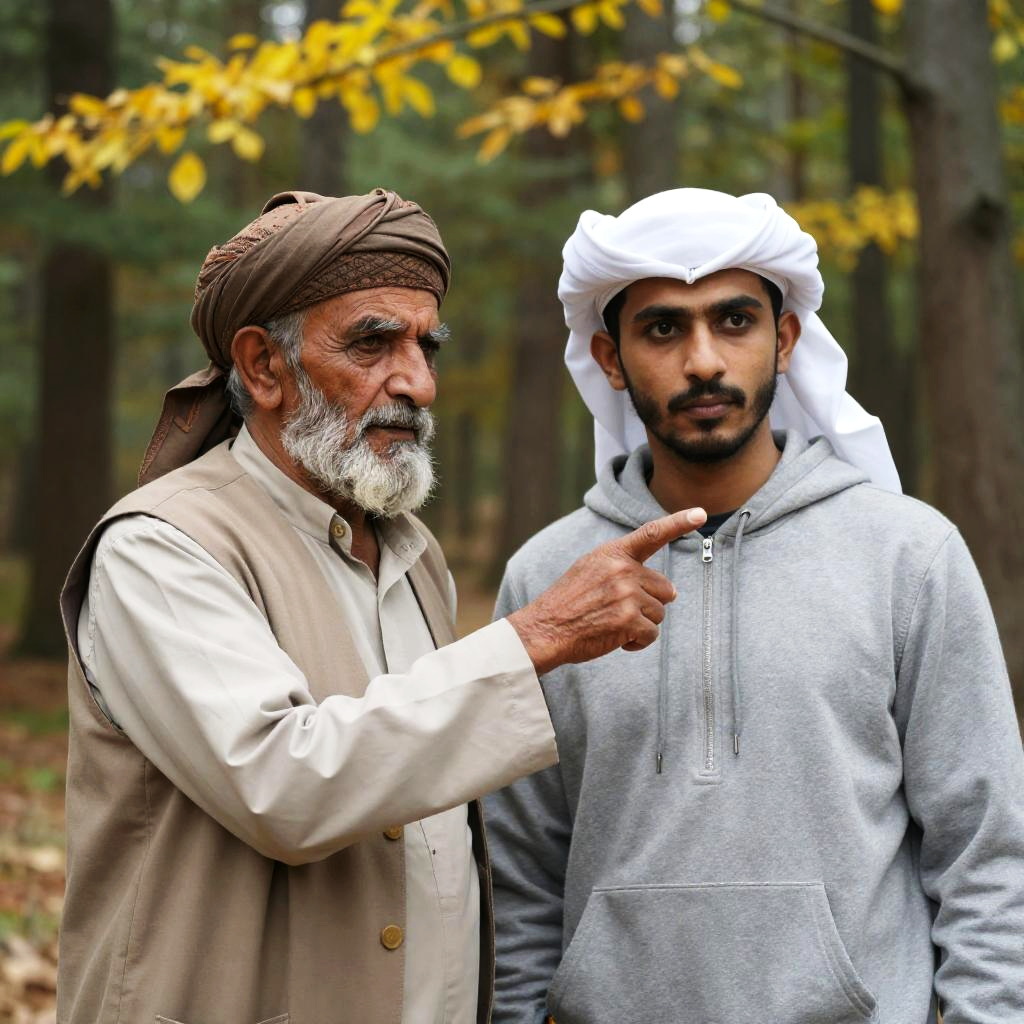 Photograph of two men in a forest. Elder man with gray beard, brown headscarf, and beige vest points with index finger. Younger man with white headscarf, gray hoodie, and mustache looks serious. Background: dense trees, yellow leaves. Elder man points at younger man. Both men have focused expressions.