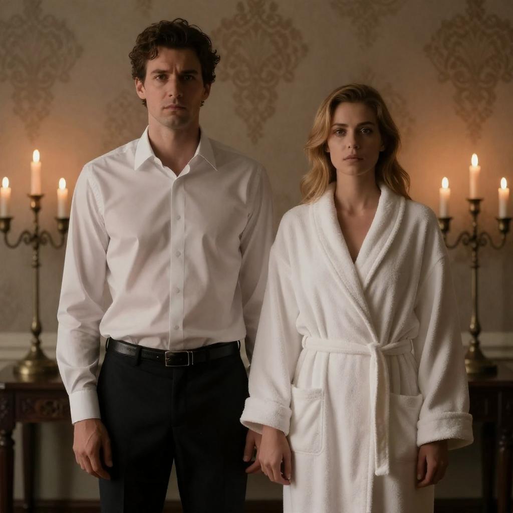 Photograph of a man and woman standing side by side in an ornate room. Woman wears black mesh dress, brown hair, serious expression. Man in brown suit, white shirt, black tie, short brown hair, serious expression. Both hold a decorative lantern with blue patterns. Red flowers in vases on both sides. Wooden panels and curtains in background.
