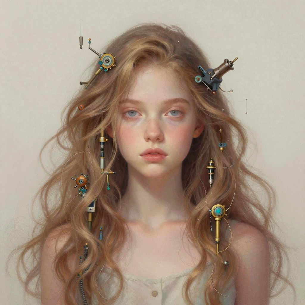 Surreal portrait in Tom Bagshaw art style, depicting a serene girl with flowing hair intertwined with delicate mechanical parts, soft pastel colors and vivid details, digital fantasy art