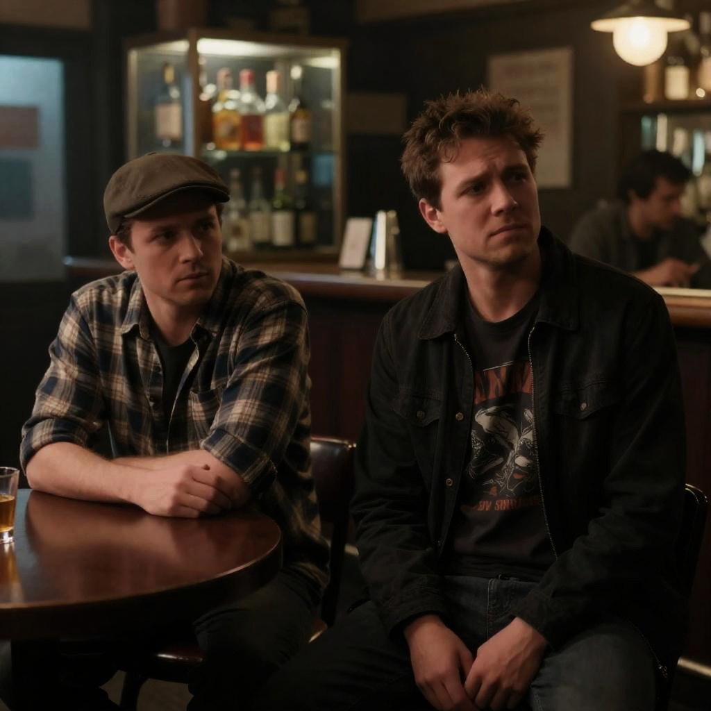 Photograph of a bar scene with six people. Two men in the foreground, one with long blonde hair in a plaid shirt pointing, the other with short black hair in a green checkered shirt. Five others in the background, laughing and smiling. Bar table with red cups and beer bottle. Chandelier in the background. Dim lighting. Casual, festive atmosphere.