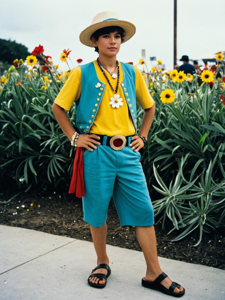 Macarena costume, hat, male focus, jewelry, necklace, 1boy, flower, solo focus, hand on own hip, standing, looking at viewer, sandals