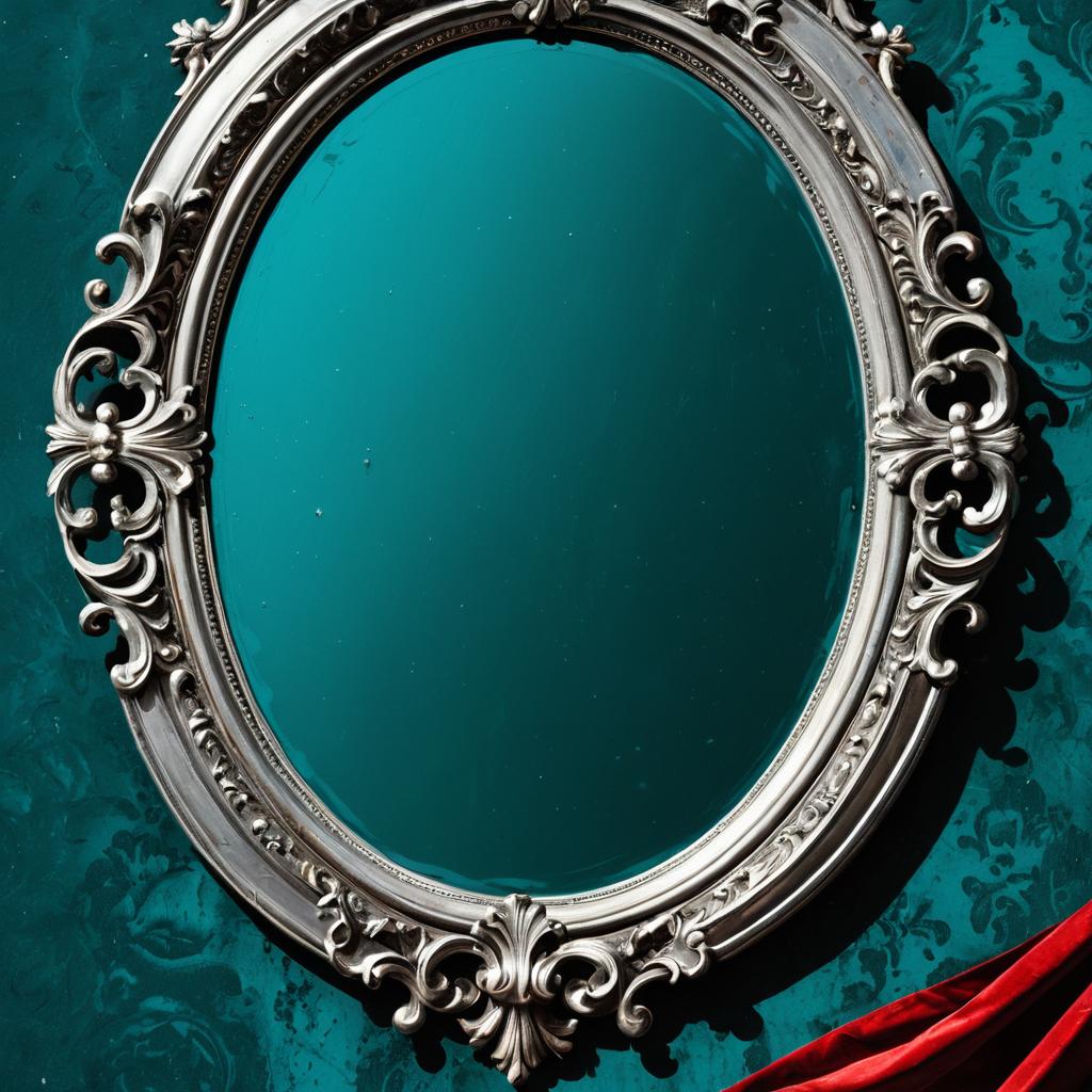Close-up of an ornate Baroque-style oval mirror frame surrounding a pool of liquid silver mercury. The mirror reflects vibrant teal tones with subtle red accents, inspired by Renaissance oil painting techniques. The intricate silver frame features detailed floral and scrollwork embellishments, set against a richly textured teal background with a hint of deep red drapery.