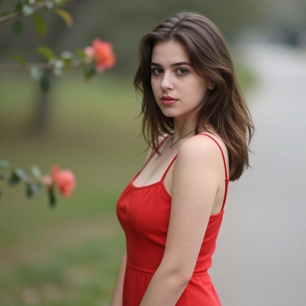 "red dress beautiful, 1girl, solo, flower, dress, blurry, outdoors, looking at viewer, blurry background, red dress, brown hair, day, depth of field Realistic photo of casual sexy person with pretty face"
