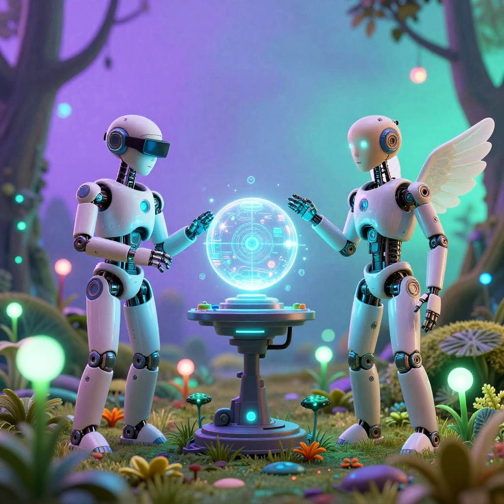 Futuristic 3D render set in a glowing cybernetic forest with luminescent plants, depicting three androids engaged in a silent conversation around a pulsating holographic orb, one wearing a visor, another with mechanical wings. The background falls from neon purple to electric teal in a smooth gradient. Whimsical tone, refined composition, tactile detail, vibrant color, soft rim light, subtle texture, high detail, balanced layout.
