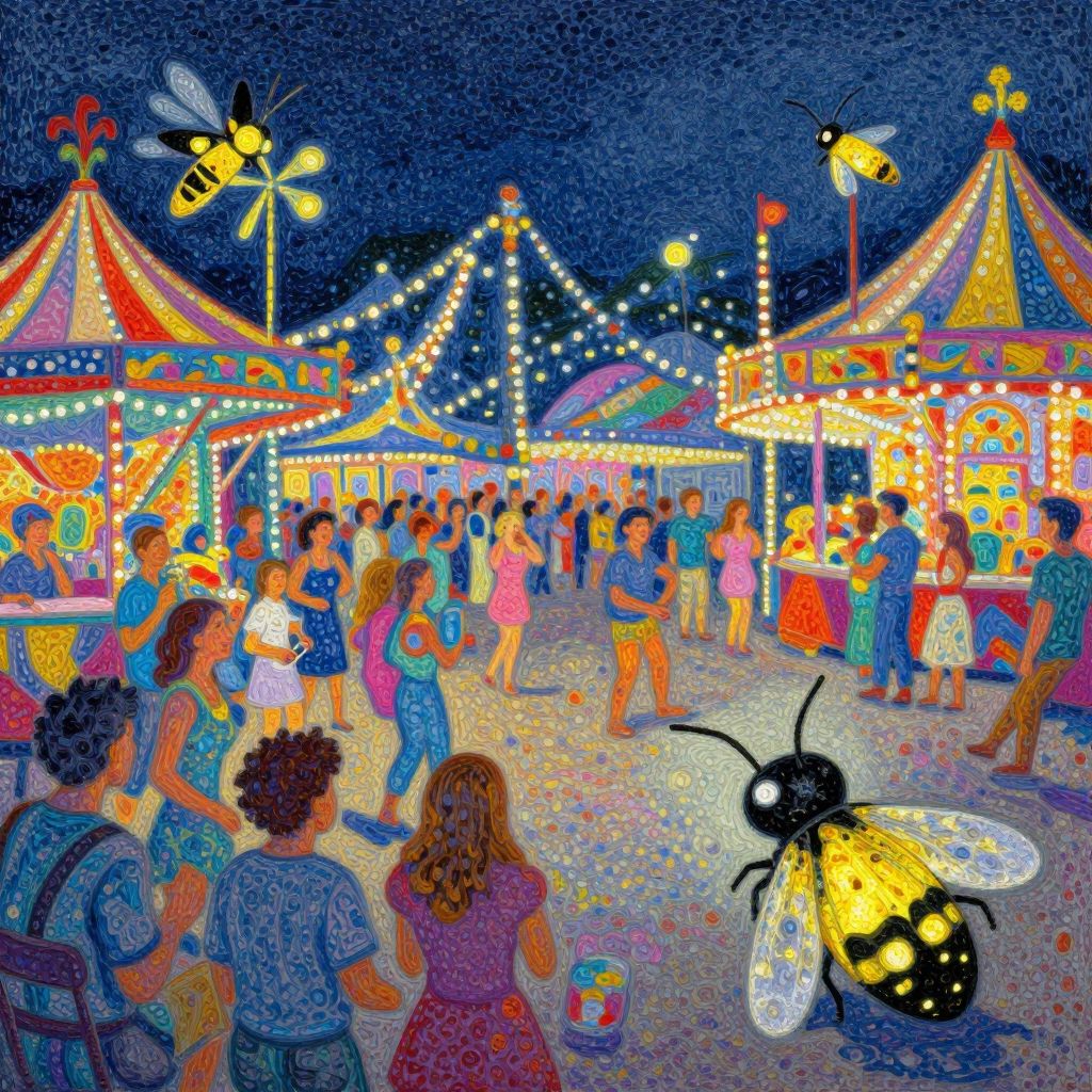 Vibrant digital painting of a nighttime carnival with colorful tents, illuminated strings, buzzing bees, a giant bee, and children in summer clothes, dancing