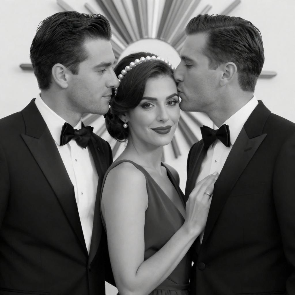 Black and white photograph of three people. Two men in black tuxedos with bow ties, slicked-back hair, facing each other. Woman in the center, head on right man's shoulder, dark lipstick, pearl headband, wearing a sleeveless dress. Background includes a metallic sunburst decoration. Right man gently kisses woman's cheek, left man looks at right man. Woman smiles softly. Right man wears a ring on his left hand.
