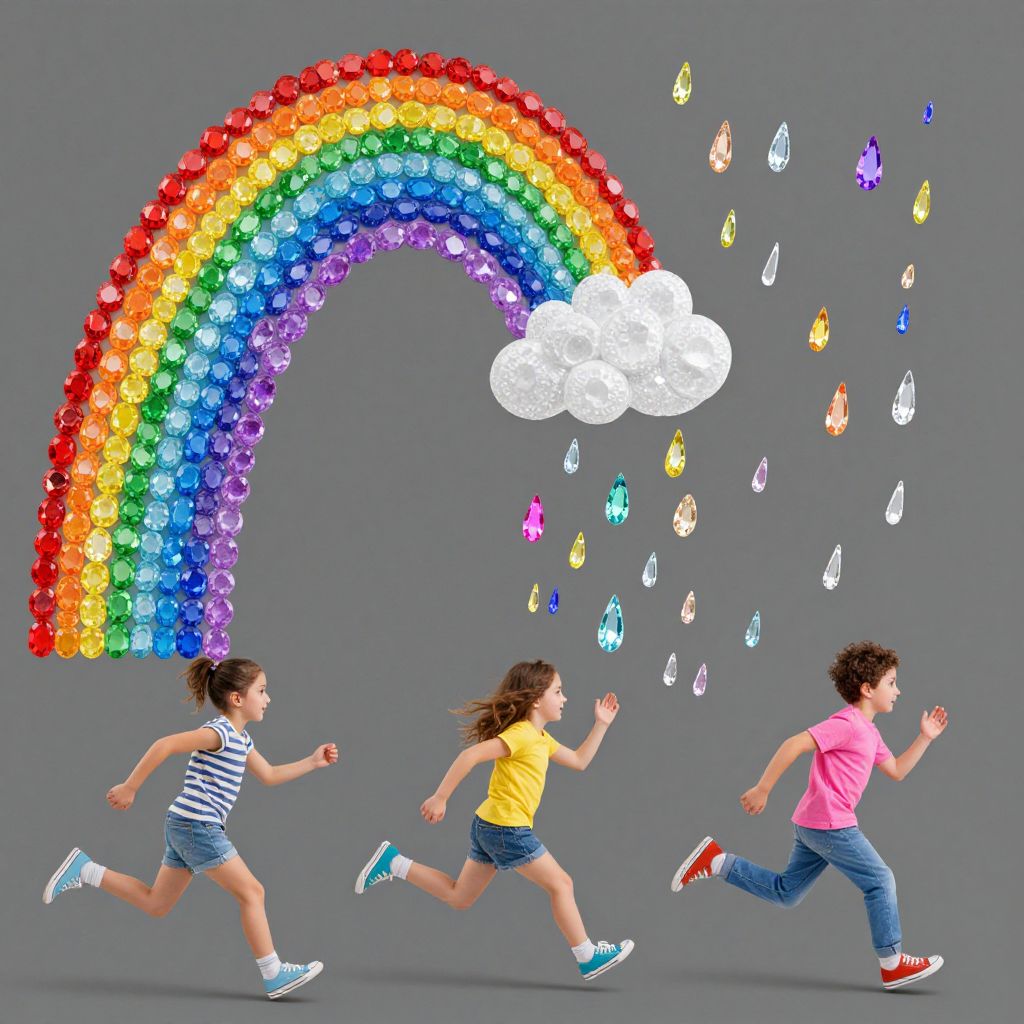 Photograph of three children running under a colorful, star-shaped rainbow with a white cloud and raindrops on a gray background.
