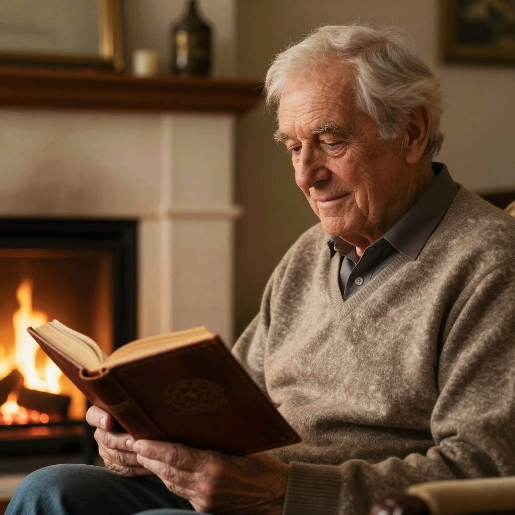 Straw haired elderly man sitting by a cozy fireplace, reading a leather-bound book, soft warm tones, detailed wrinkles and serene smile, intimate and nostalgic mood
