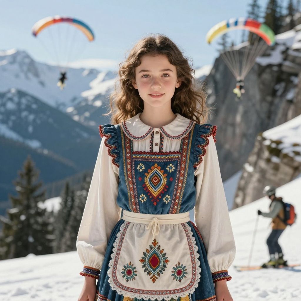 A beautiful Neo-Bohemian girl, wearing Cute apron-style dress with a peter pan collar shirt, (Cliff Base Skiing (skiing off cliffs and deploying parachutes):1.3) UHD, 4k, cinematic