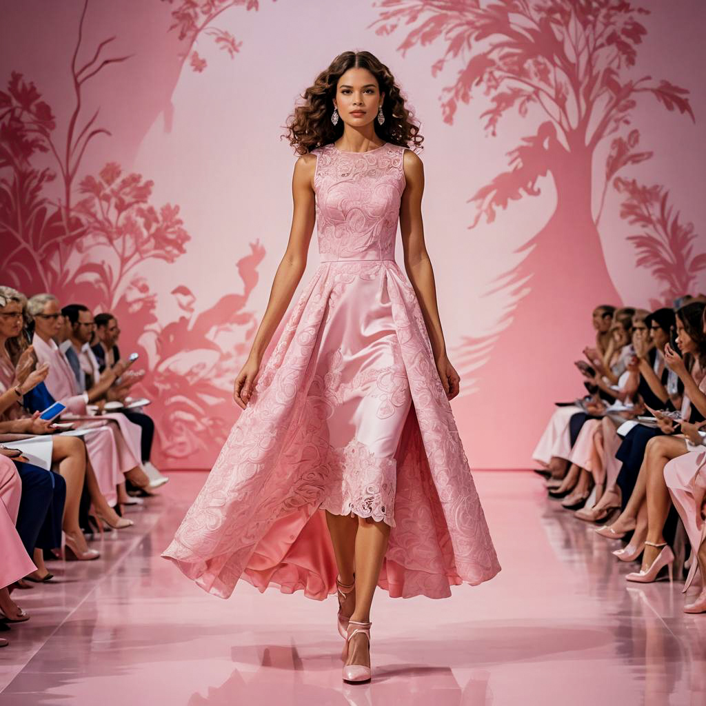 Fashion model with long curly hair wearing a sleeveless pink guipure lace dress with coral satin fabric and matching pink high heels. She is walking on a pastel pink runway during a fashion show, with an audience dressed predominantly in pink seated on both sides. The style is elegant and feminine with silver accessories.