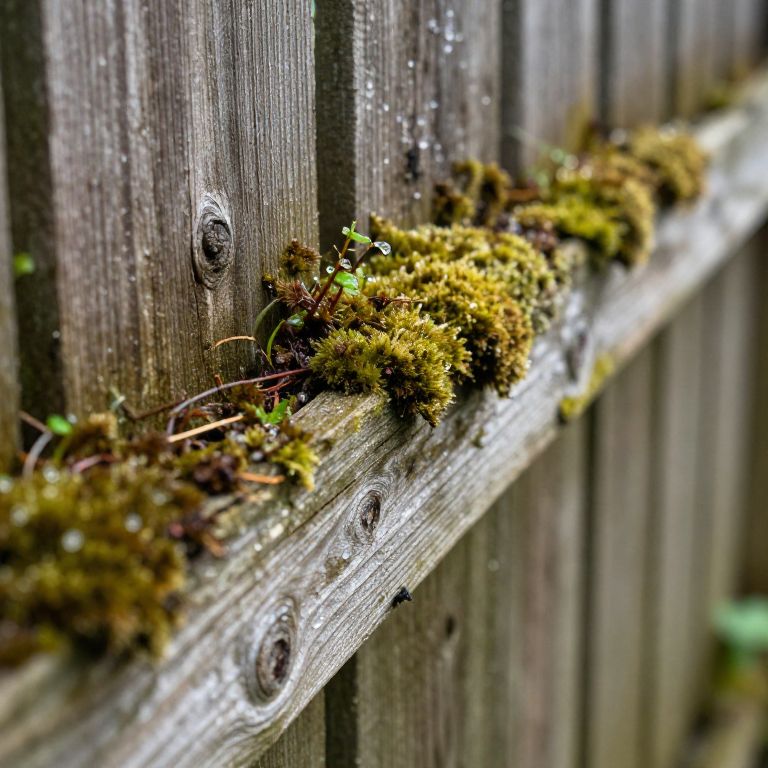 This close-up photograph captures a weathered wooden fence with vertical slats. The fence shows prominent knots and a textured, aged surface. Moss, in shades of green and yellow, clings to the top edge of the fence, adding a natural, organic element. Tiny droplets of water are visible on the moss, suggesting recent rain. The background is blurred, focusing attention on the detailed textures of the wood and moss. The image uses a shallow depth of field, emphasizing the foreground while the background remains out of focus. The overall color palette includes earthy browns, greens, and yellows.