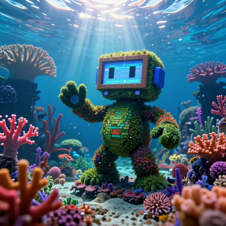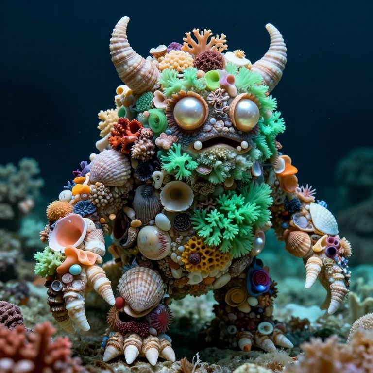 The image showcases a photorealistic monster created entirely from ocean treasures, with its body and limbs formed by a mosaic of shells, corals, and anemones. The monster's eyes are shining pearls, and its mouth is formed by a small opening between two large seashells. The body is a mix of different textures and colors, with the bright hues of coral contrasting with the soft shades of seafoam green. The monster's body is adorned with a variety of textures, including the rough, spiky corals and the smooth, rounded shells. The overall composition is serene and tranquil, capturing the beauty and wonder of the underwater world. The monster's limbs are spread out, with its front limbs reaching forward and its back limbs positioned behind it. The background is dark, which highlights the vibrant colors and intricate details of the monster. The image is a stunning representation of the beauty and complexity of the ocean's treasures.