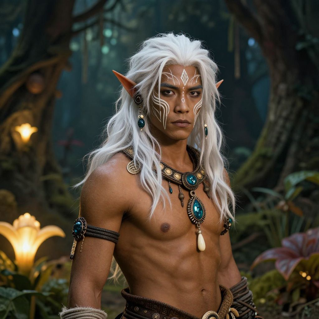 A fantasy character with white hair on tan skin, wearing tribal-inspired clothing, standing in a mystical forest with glowing flora, dramatic lighting emphasizing the contrast between hair and skin, intricate details on face and costume, surreal atmosphere