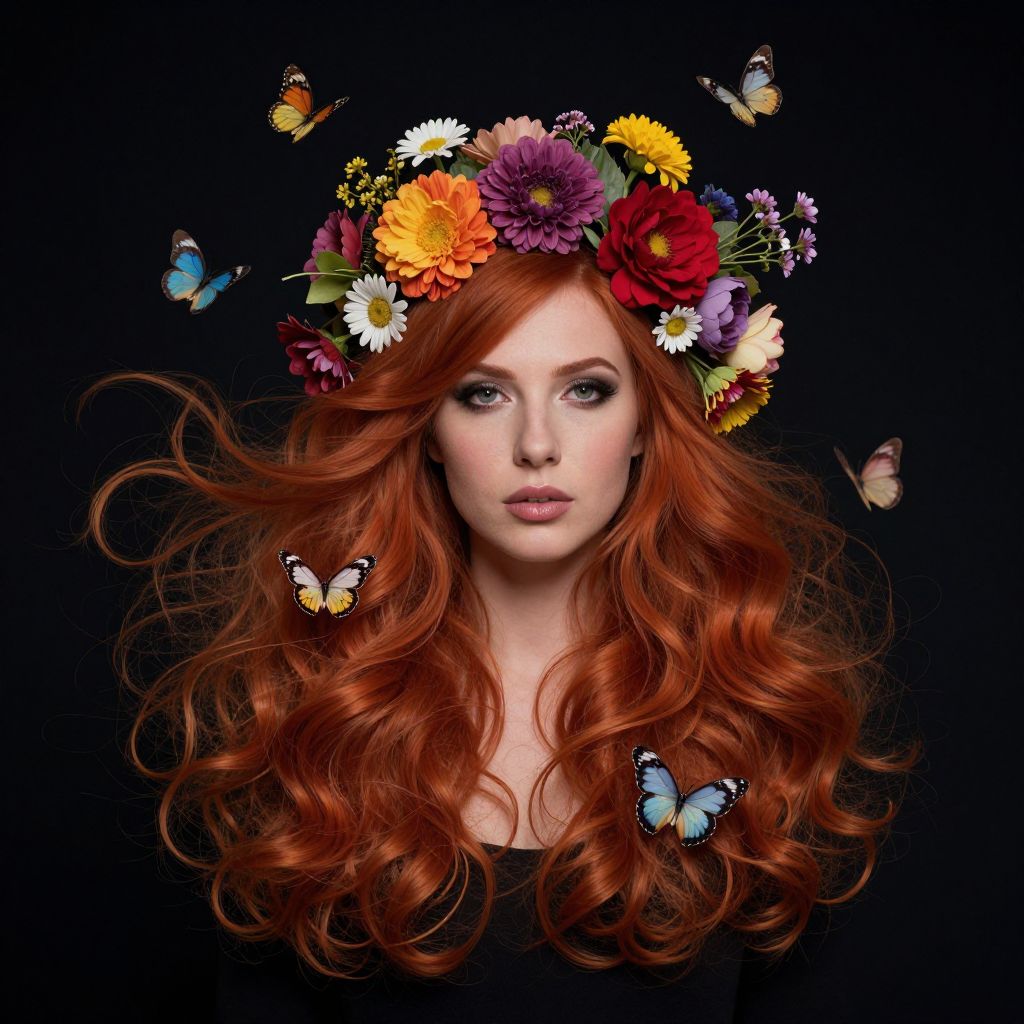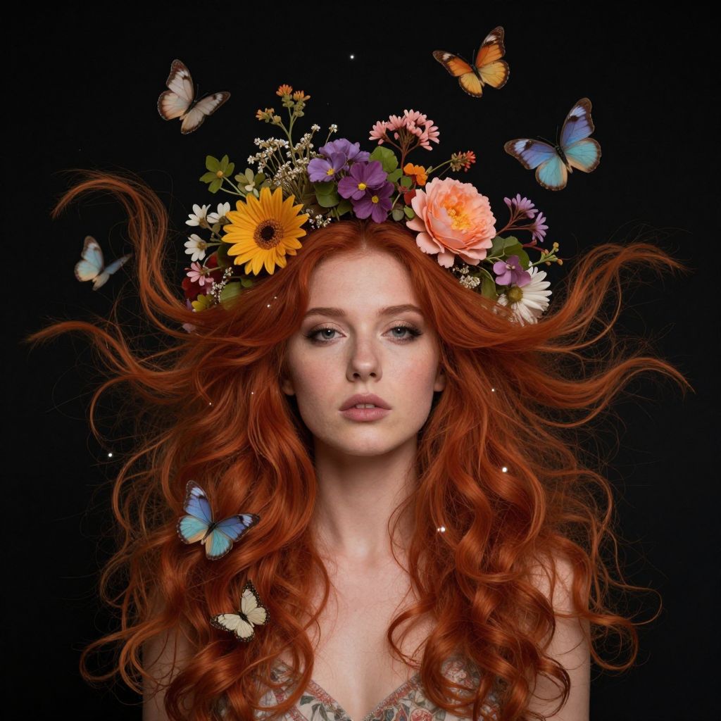 A surreal portrait of a woman with vibrant red hair adorned with blooming flowers and delicate butterflies, defying gravity as they float amidst her flowing locks against a dark, starlit backdrop.