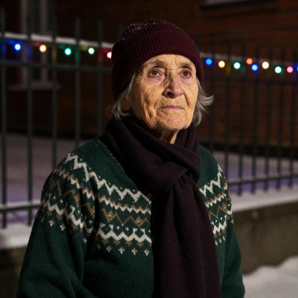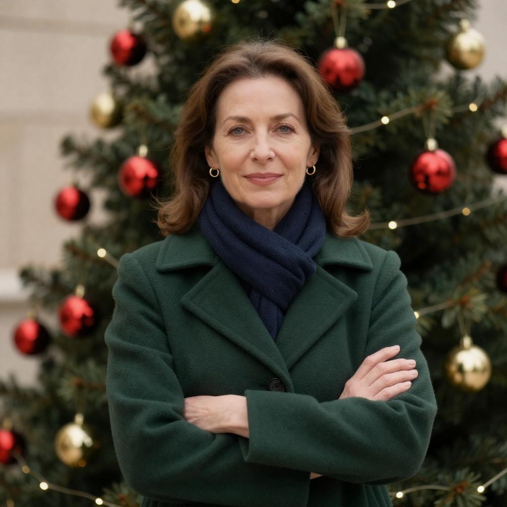 Older woman with short blonde hair wearing a red hat adorned with green holly and a red bow, and a red winter coat with white snowflake patterns. She has a neutral expression. Background features blurred, glowing Christmas tree lights. Single person, festive clothing, holiday theme.